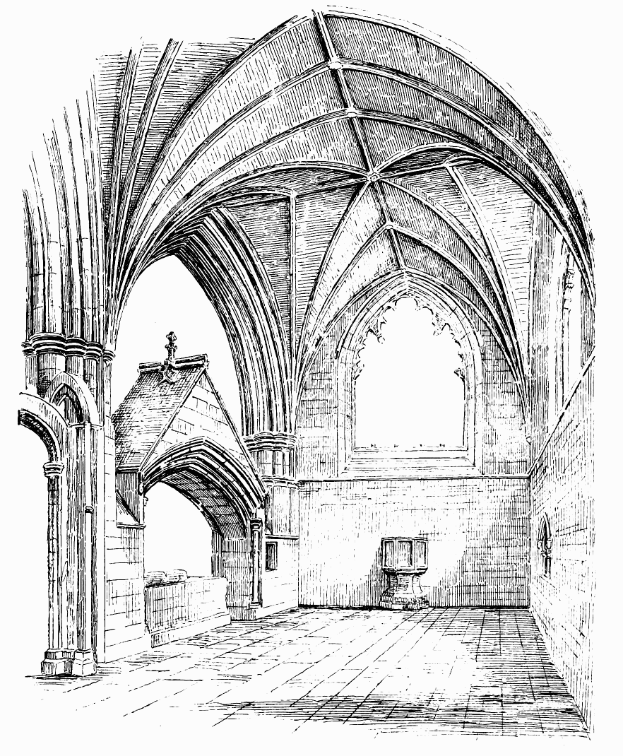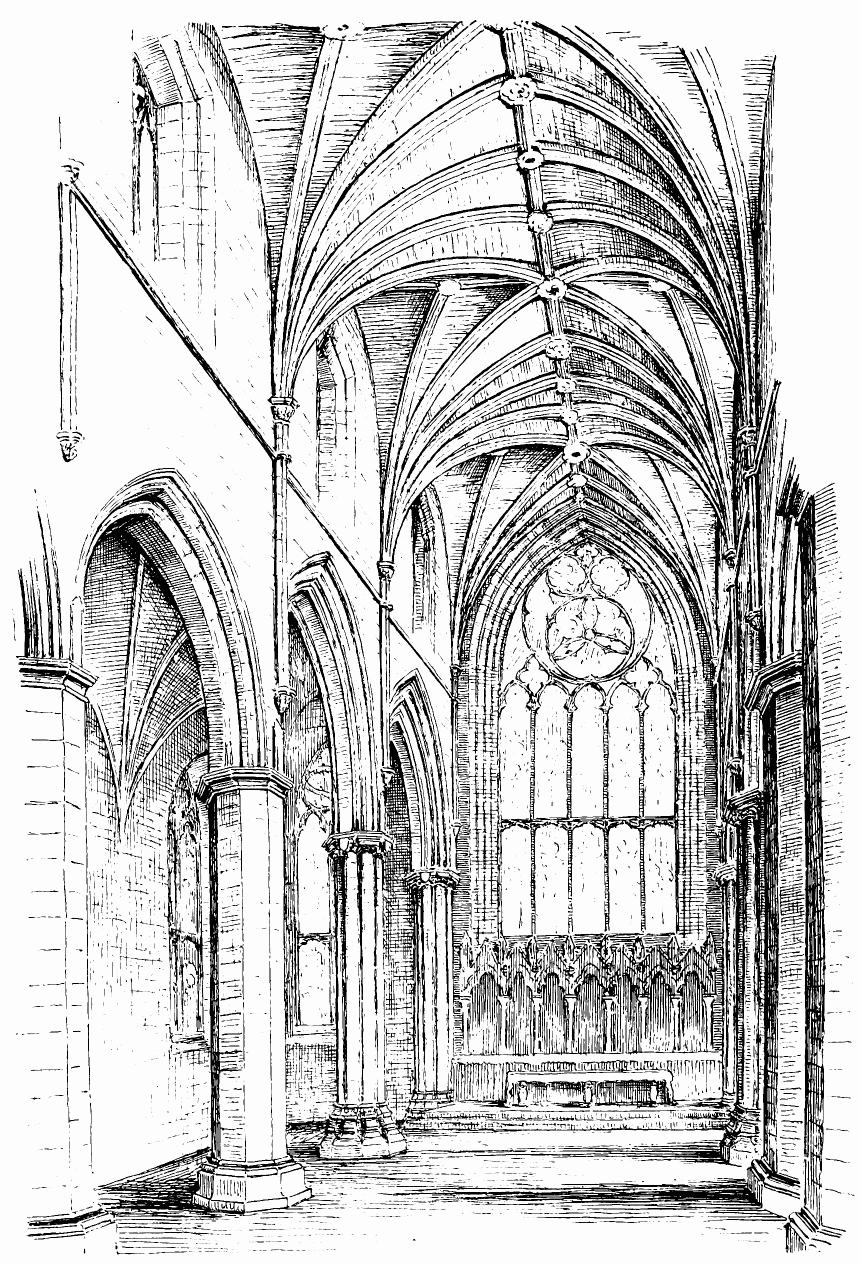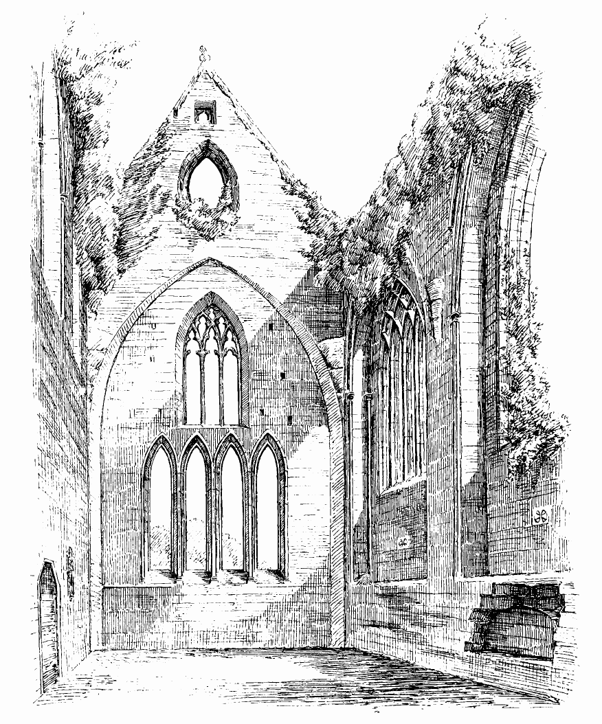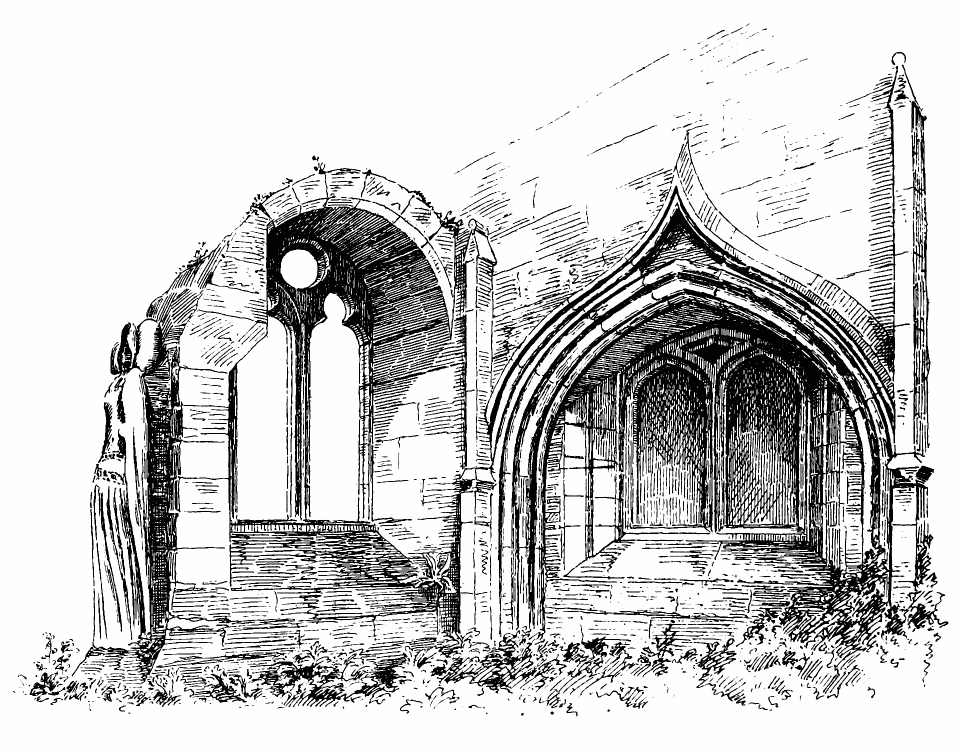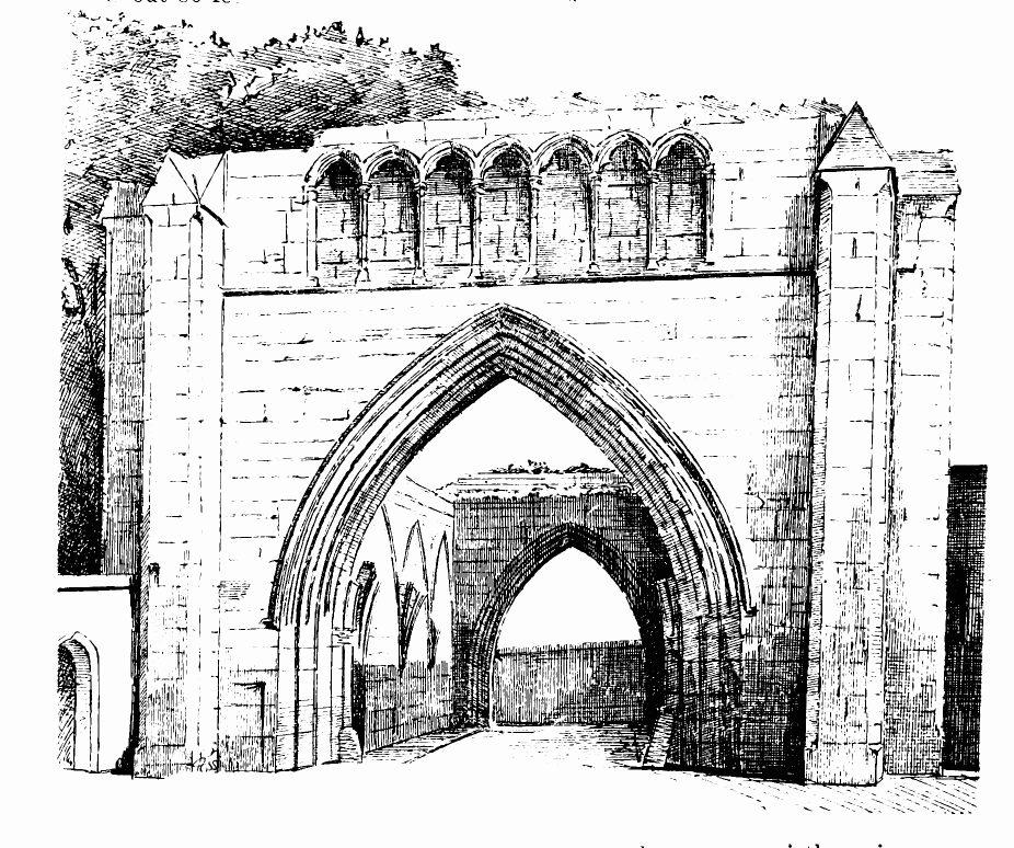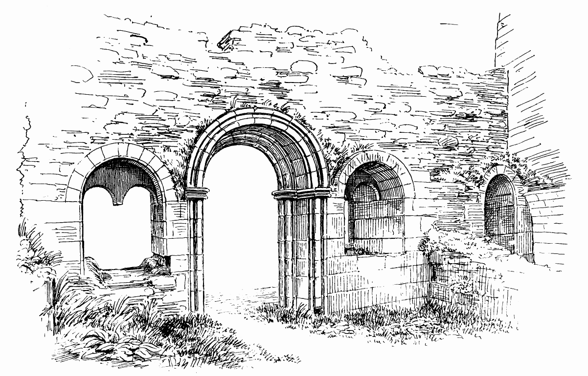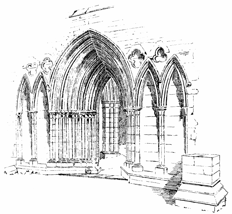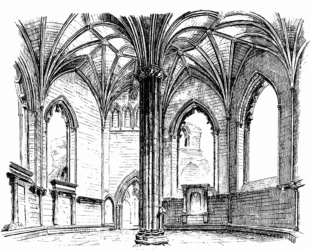 “He [Halderston] built the eastern gable from the foundations, along with its arch [arcuali voltâ].” As Lord Bute remarks—“This must mean only the east window, the greater part of the east wall being of transition work” (see Figs. 443-444.) “He adorned pleasingly the hinder vestry [revestiarium] with the reliques and other restorations and cases [clausaris] at considerable expense.”