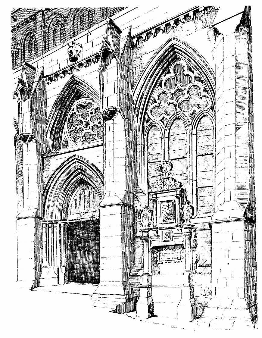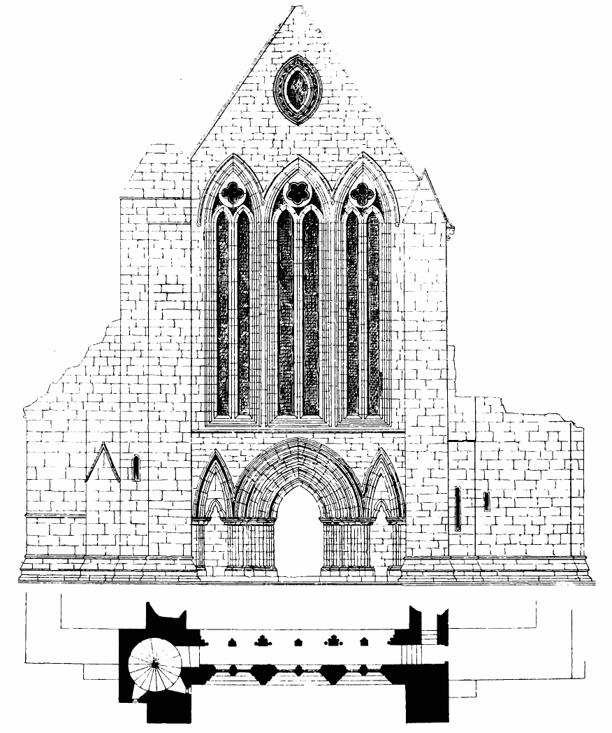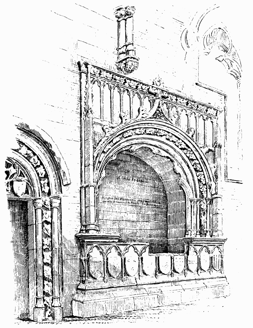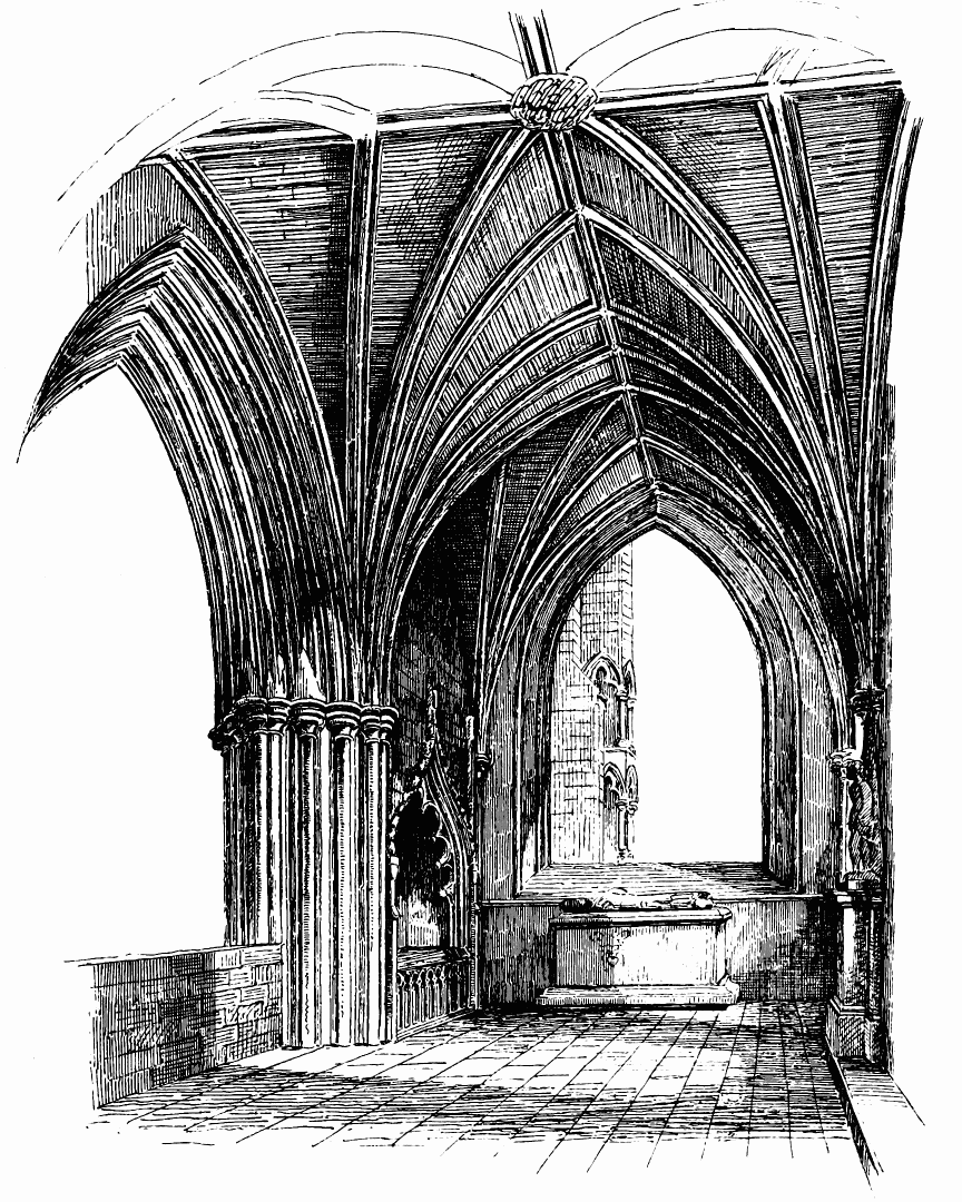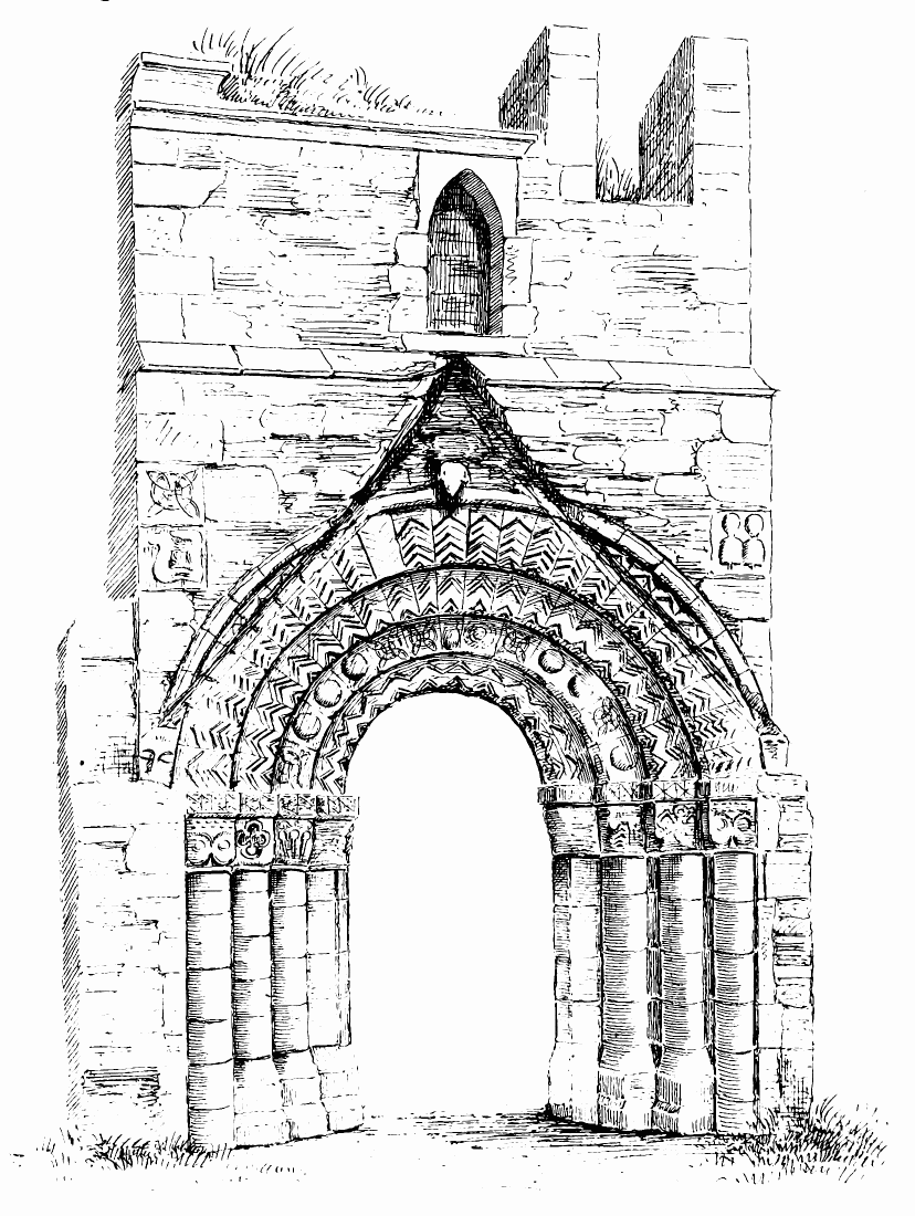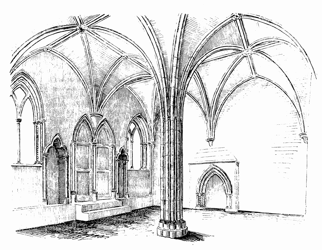 “He [Halderston] built the eastern gable from the foundations, along with its arch [arcuali voltâ].” As Lord Bute remarks—“This must mean only the east window, the greater part of the east wall being of transition work” (see Figs. 443-444.) “He adorned pleasingly the hinder vestry [revestiarium] with the reliques and other restorations and cases [clausaris] at considerable expense.”
