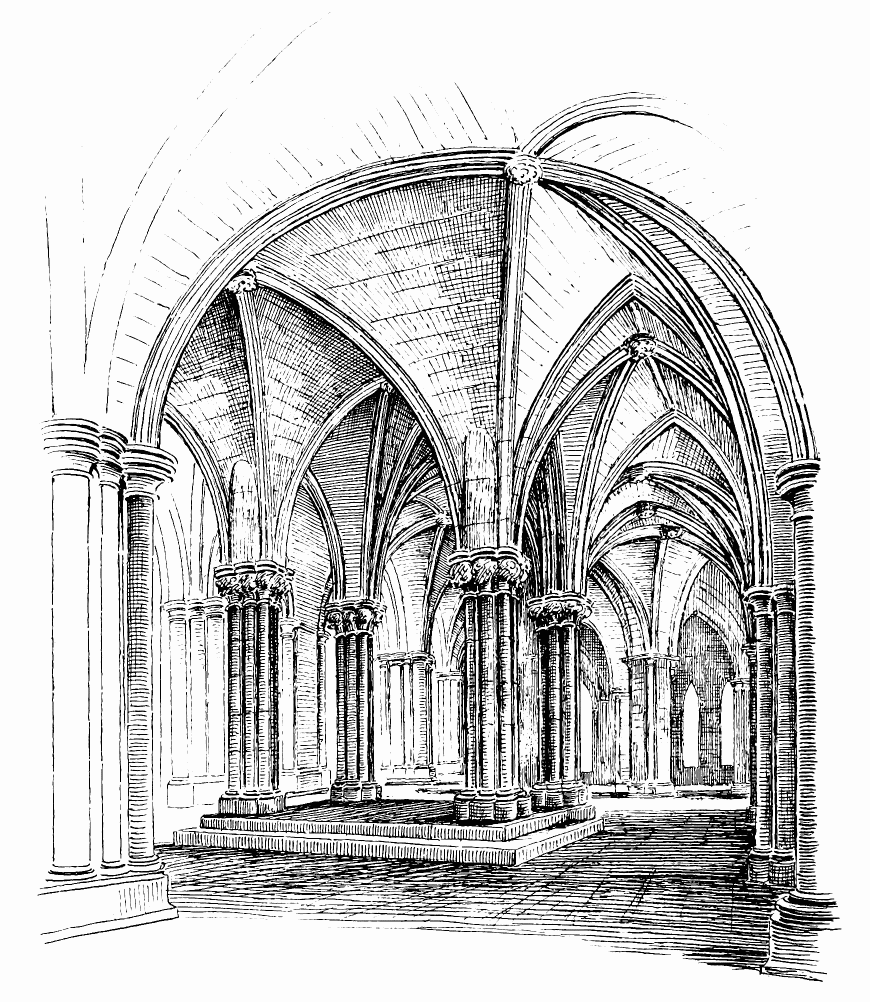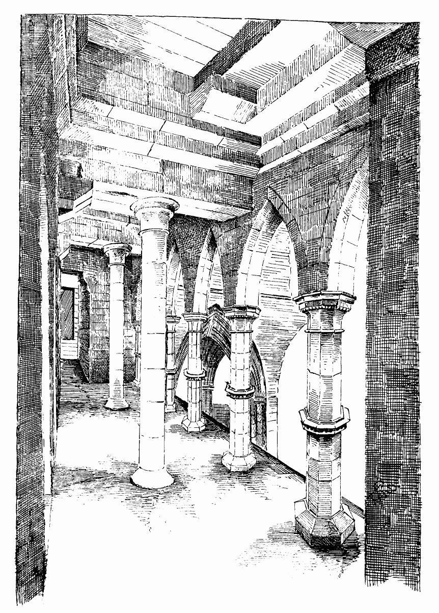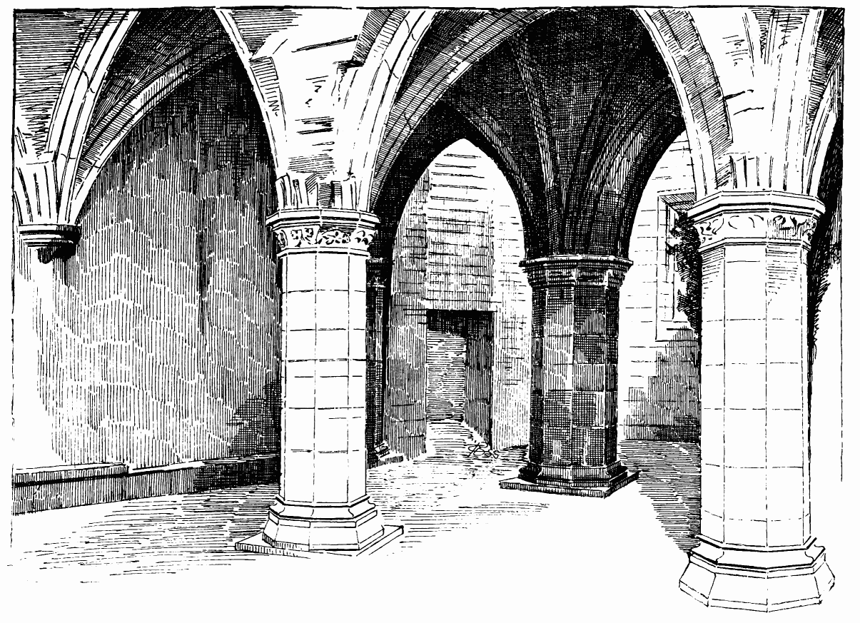The whole of the crypt of the refectory (see Fig. 454) has been excavated and the pillars uncovered, showing that there were two rows of pillars and three vaults in the width of the building. The pillars, which are round, have been restored so far as they were incomplete, and so have the groined arches, the new work being executed in red sandstone, so that it may be easily distinguishable from the old work, which is of a light coloured freestone. The masonry of the old pillars being considerably shattered, it has been found necessary, in restoring the crypt, to insert an iron column in the heart of each pillar, in order to give them sufficient strength to carry the weight of the vault. It is not known to what use this crypt was applied.