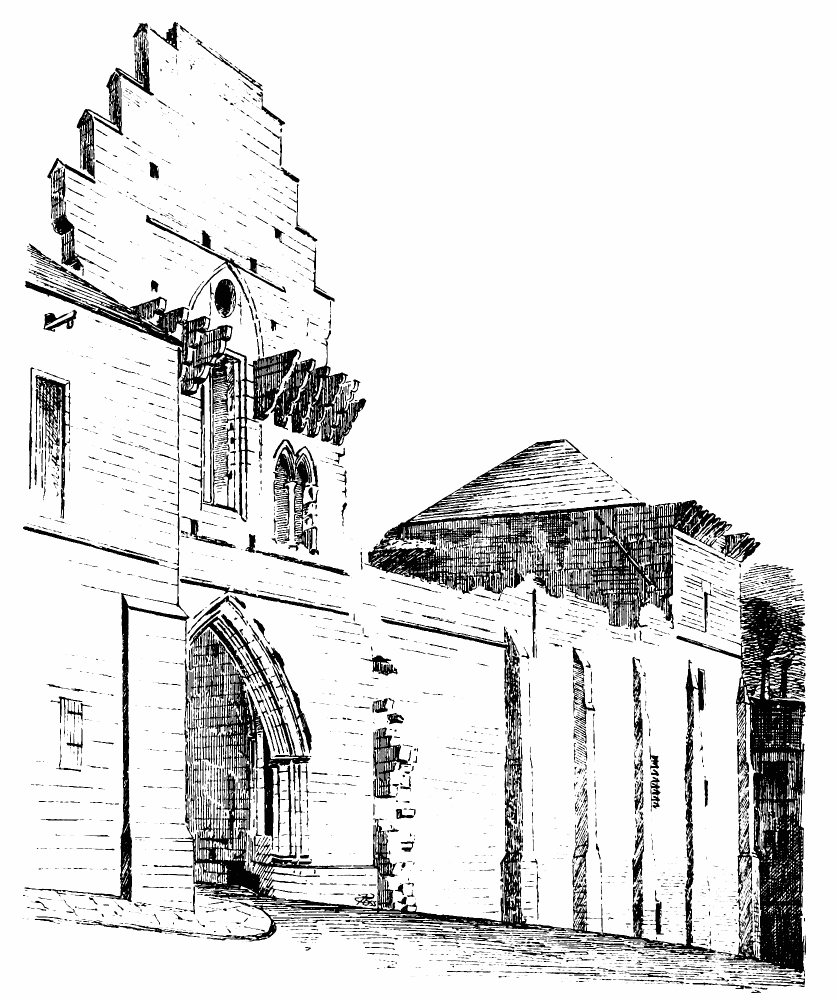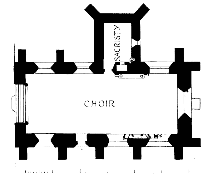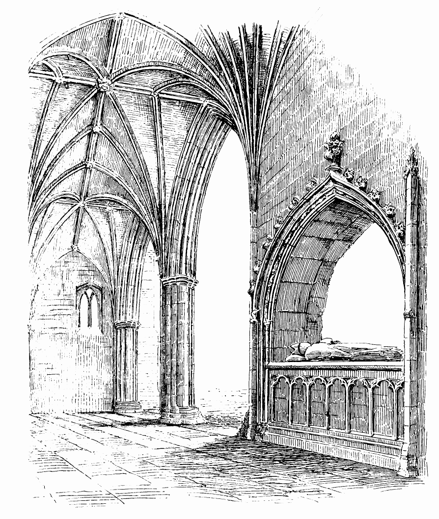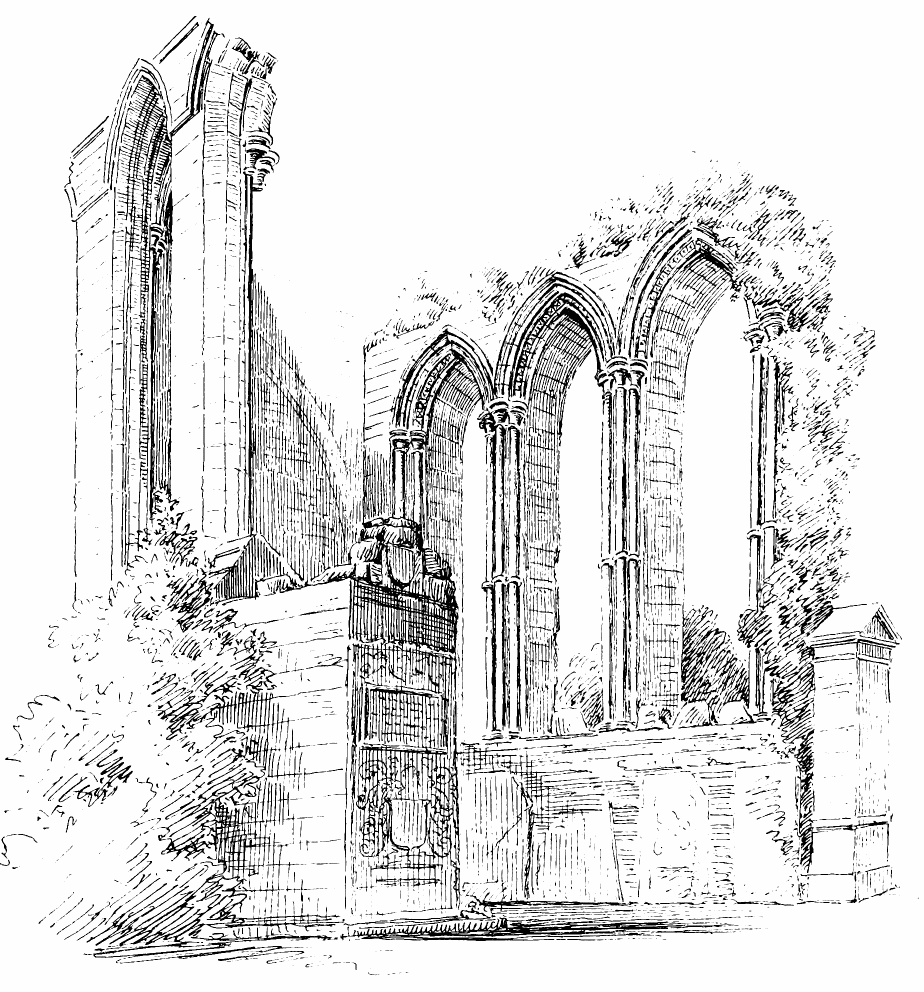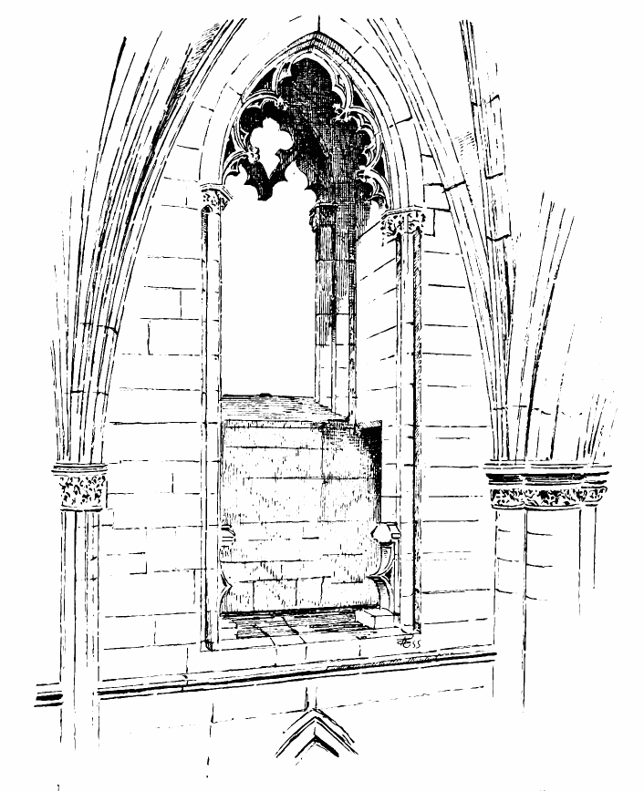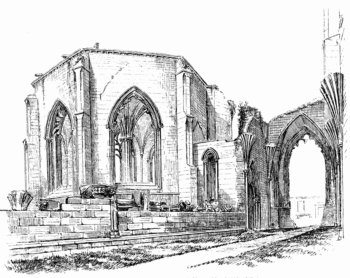 Lord Bute thinks that “the revestiarium is evidently the east end of the church behind the high altar, sometimes wrongly called the Lady Chapel,” and refers for the use of this term to the contemporary accounts of the death of the Red Comyn, in which he is sometimes stated to have been dragged by the friars into the vestry, and sometimes behind the altar, thus showing the space behind the altar to have been the vestry.