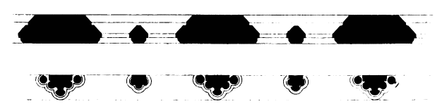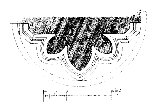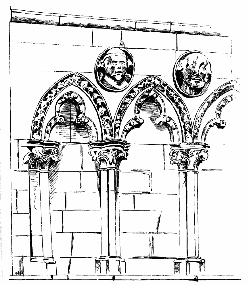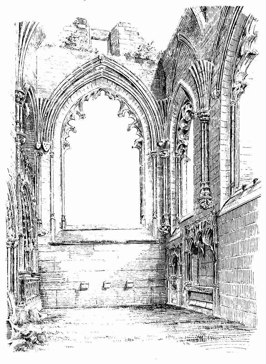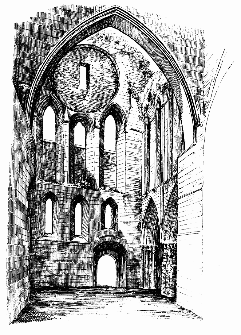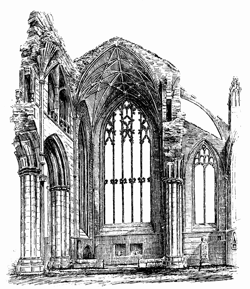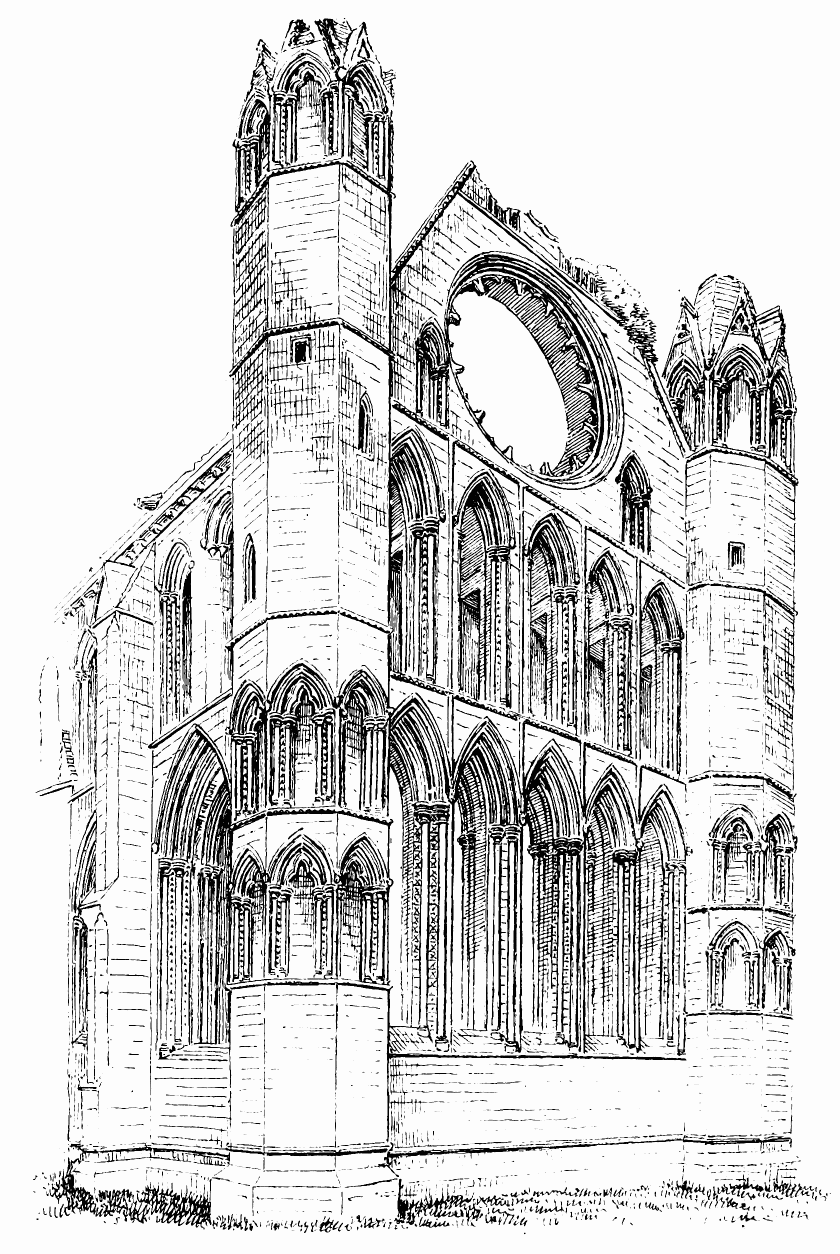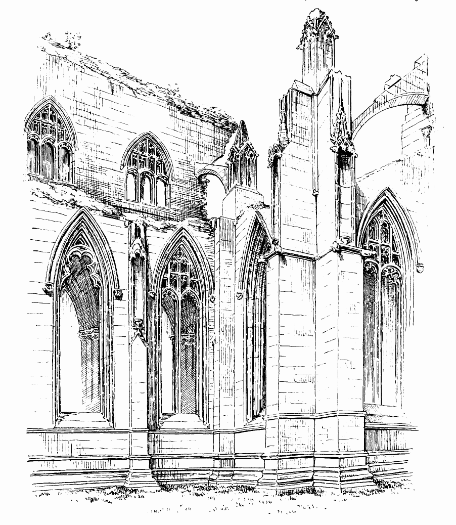 There is, however, at Melrose an entire absence of the heavy blank wall so often introduced over the main arcade, although the absence of any triforium makes the building seem somewhat low and squat. The large amount of solid masonry over the exterior of the great east window of the choir and south window of the transept is likewise a defect. The round abacus is almost always used at Melrose, but the shafts of the piers are simple and distinct, and each member carries a clearly defined series of mouldings.