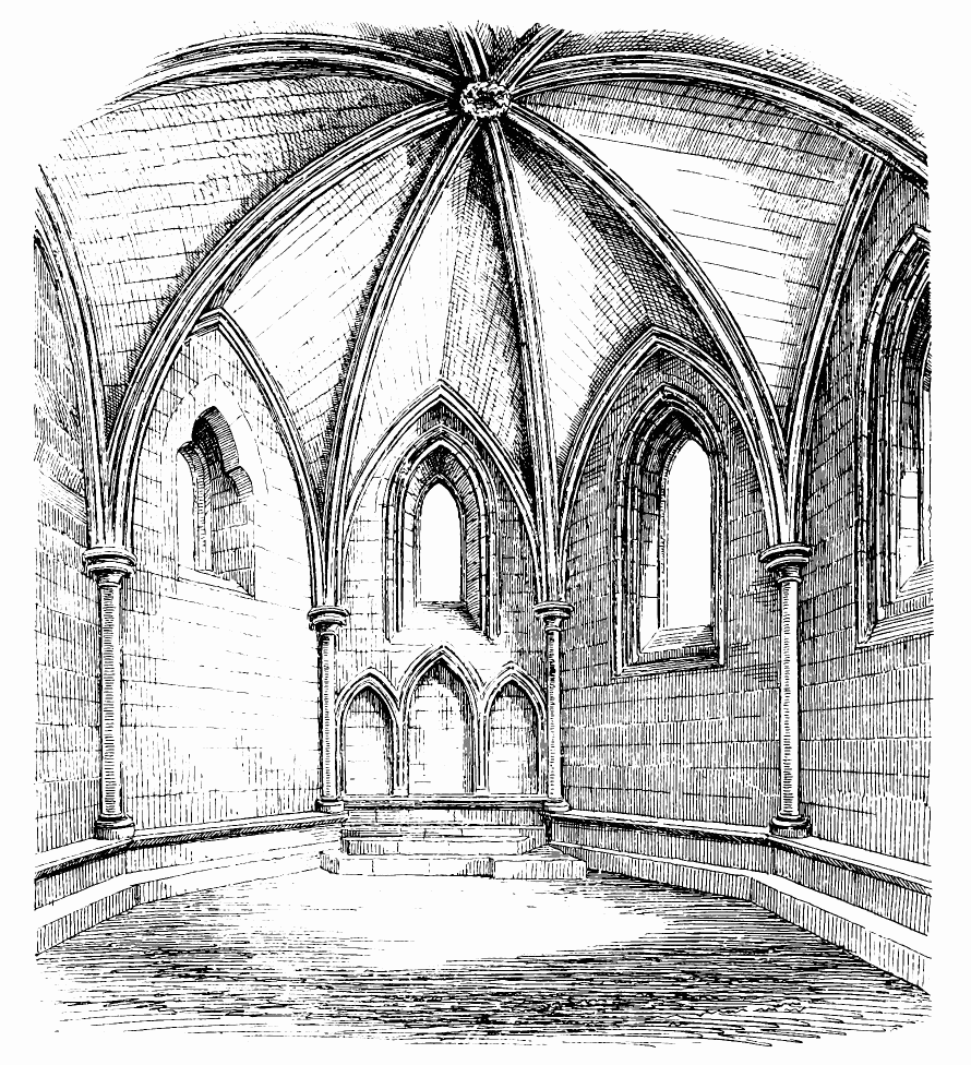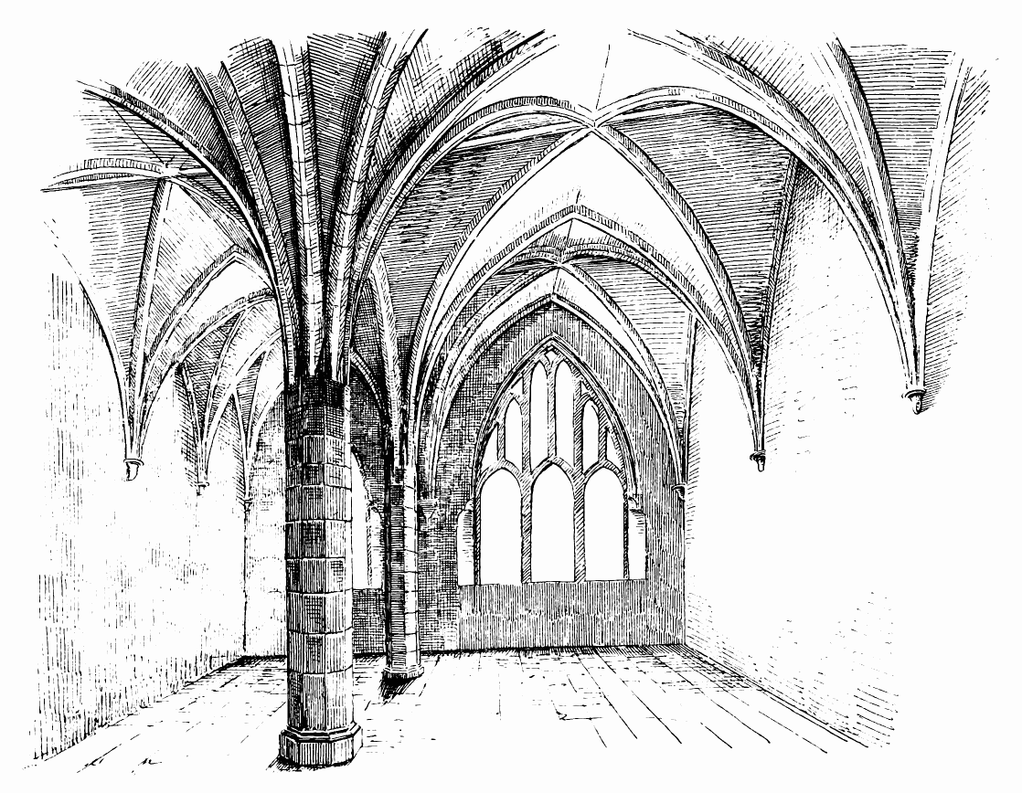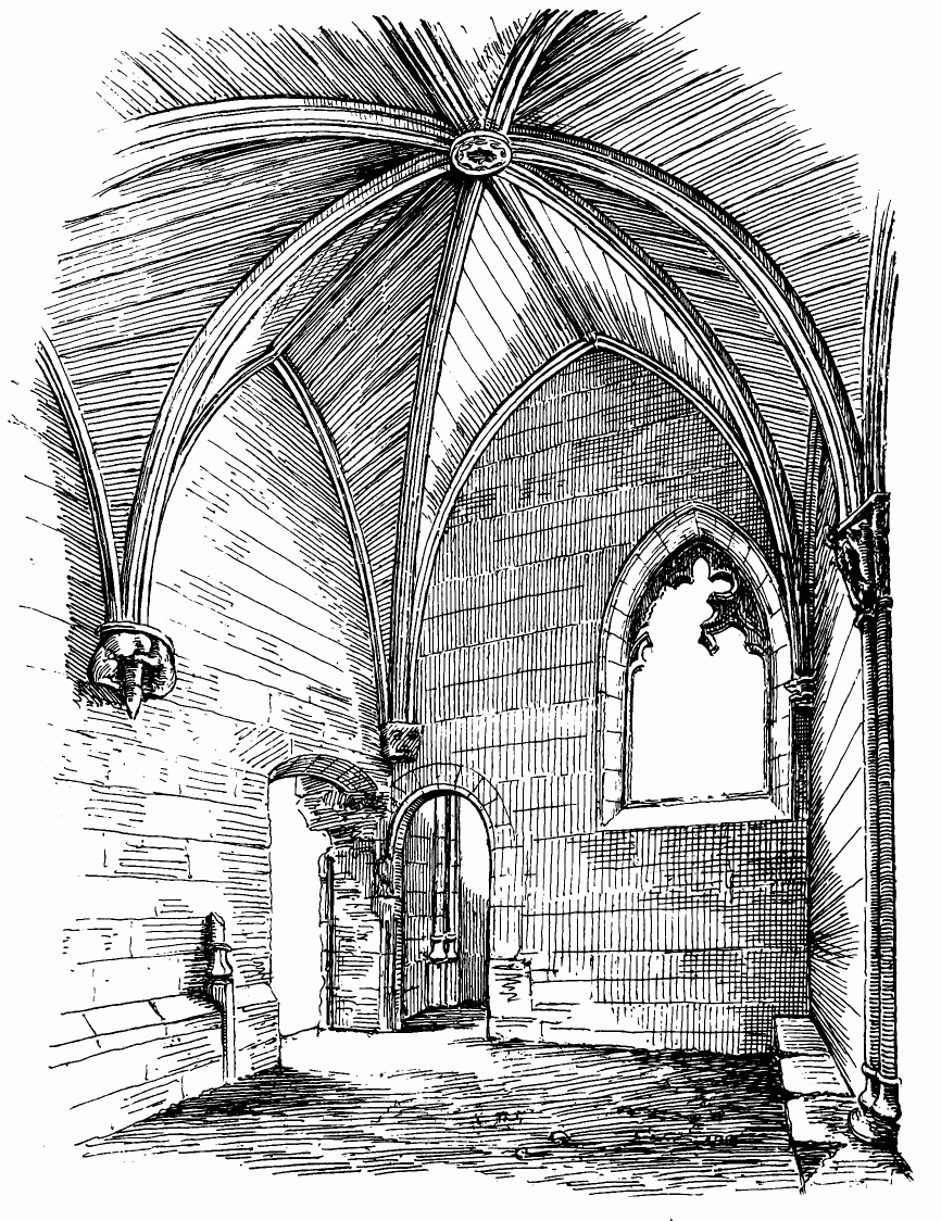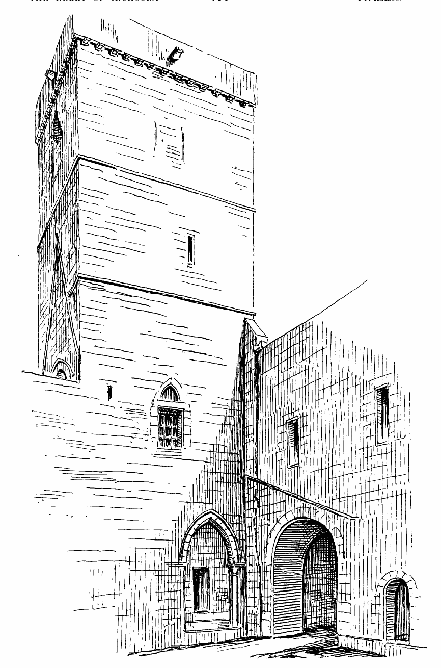 “Bower states (pp. 368-369) that Prior John of Haddington, who sat 1263-1304, ‘made the great chamber which is situated in the east part of the monastery, beside the burying-ground;’ that Prior John of Forfar (1313-1321) ‘built the new chamber adjoining the cloister, which the priors have usually had, and which Prior William of Lothian (1340-1354) afterwards enclosed on every side with a very strong wall;’ also, that William of Lothian roofed ‘the eastern chamber’ at great expense.” Lord Bute goes on to say—“My impression is, that the ‘new chamber’ is that afterwards called the senzie chamber; several priors and bishops are mentioned as having died ‘in the prior’s chamber,’ but that Halderston rebuilt the eastern chamber, erecting a fine house there, and also rebuilding some rather decayed old oratory on a finer scale [decentiori]. He was the first who obtained for the priors the use of the pastoral insignia—viz., the mitre, staff, and ring. ‘He strikingly increased for their glory the pomp of divine service, at the celebration of the mass of our lady in her chapel. [Probably it was the custom for the priors to sing or say it on certain days, or every day].... In his days the Lord William Bower, vicar of St. Andrews, completed the altar of [Christ] crucified in the nave of the church, adorned with its permanent [solido] throne and sumptuous figures; and likewise William of Ballochy, his sub-prior, with the desire of the said prior, completed in a very beautiful and comely manner the space of the dormitory at the sides and the other pavements.’”