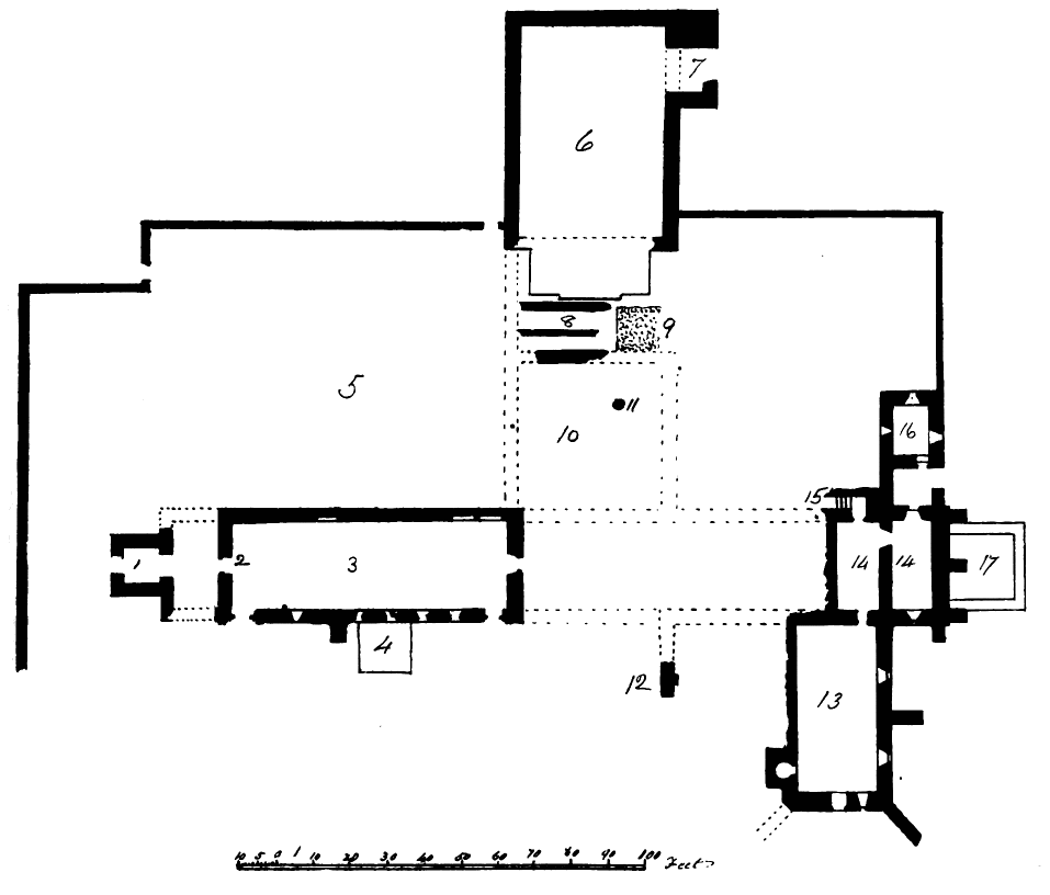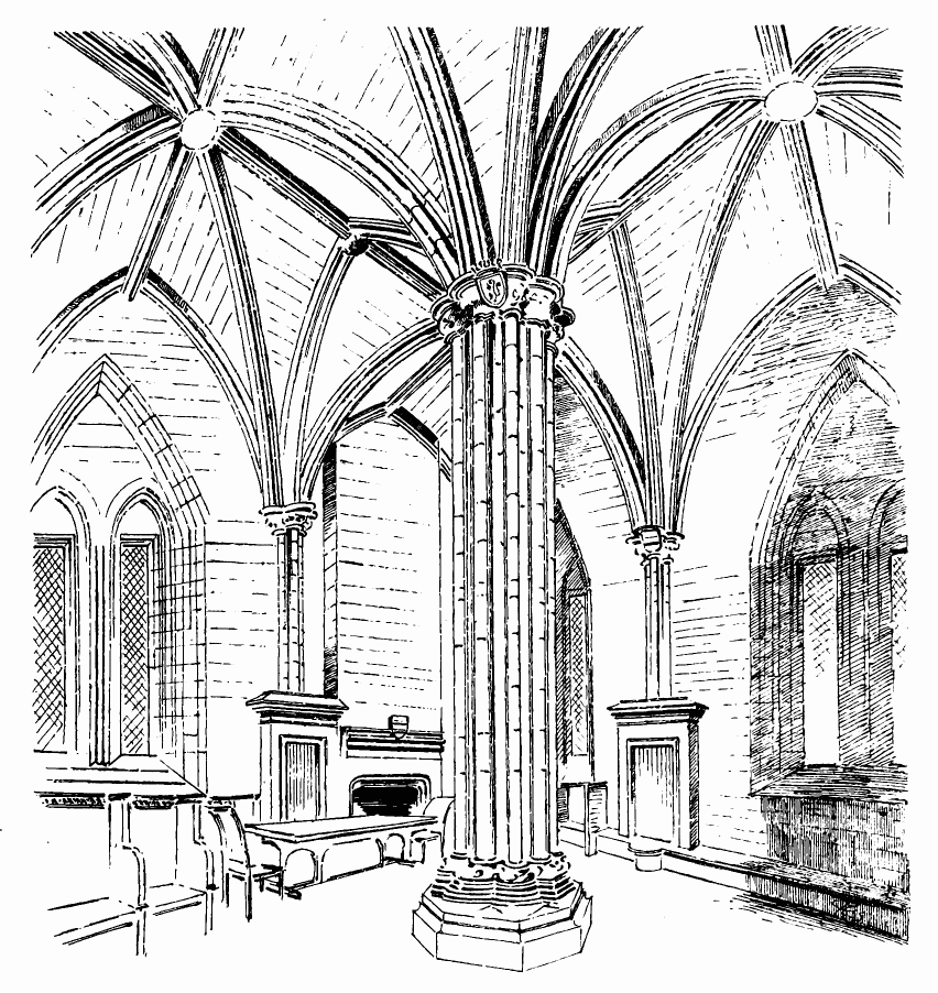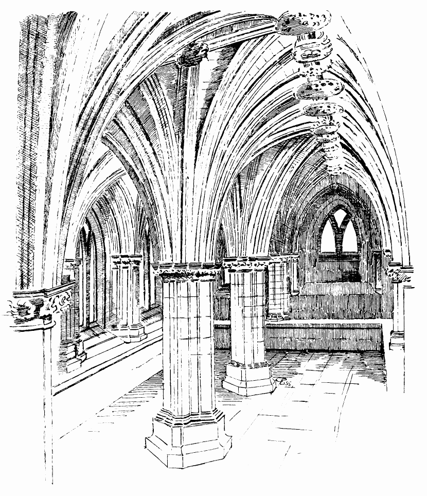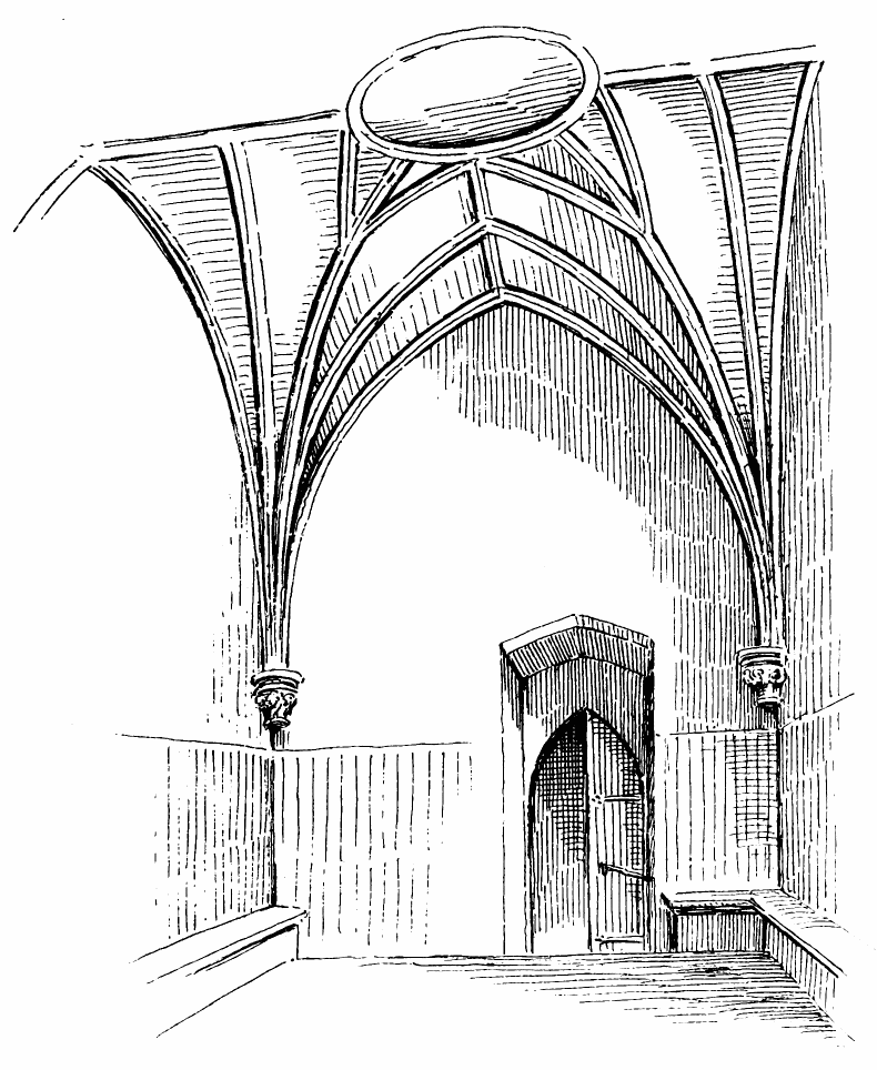 “Bower states (pp. 368-369) that Prior John of Haddington, who sat 1263-1304, ‘made the great chamber which is situated in the east part of the monastery, beside the burying-ground;’ that Prior John of Forfar (1313-1321) ‘built the new chamber adjoining the cloister, which the priors have usually had, and which Prior William of Lothian (1340-1354) afterwards enclosed on every side with a very strong wall;’ also, that William of Lothian roofed ‘the eastern chamber’ at great expense.” Lord Bute goes on to say—“My impression is, that the ‘new chamber’ is that afterwards called the senzie chamber; several priors and bishops are mentioned as having died ‘in the prior’s chamber,’ but that Halderston rebuilt the eastern chamber, erecting a fine house there, and also rebuilding some rather decayed old oratory on a finer scale [decentiori]. He was the first who obtained for the priors the use of the pastoral insignia—viz., the mitre, staff, and ring. ‘He strikingly increased for their glory the pomp of divine service, at the celebration of the mass of our lady in her chapel. [Probably it was the custom for the priors to sing or say it on certain days, or every day].... In his days the Lord William Bower, vicar of St. Andrews, completed the altar of [Christ] crucified in the nave of the church, adorned with its permanent [solido] throne and sumptuous figures; and likewise William of Ballochy, his sub-prior, with the desire of the said prior, completed in a very beautiful and comely manner the space of the dormitory at the sides and the other pavements.’”