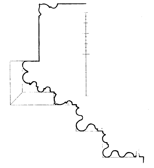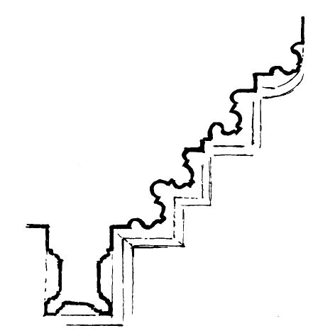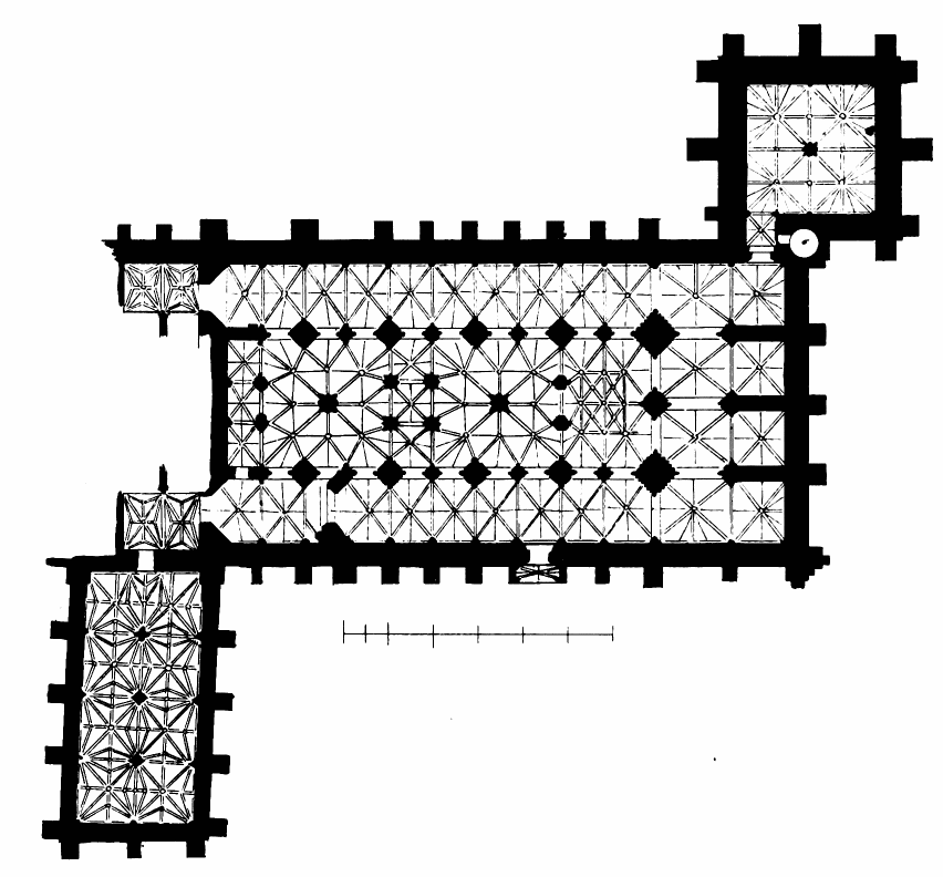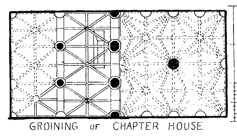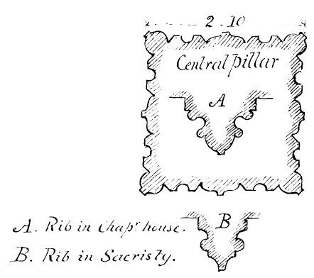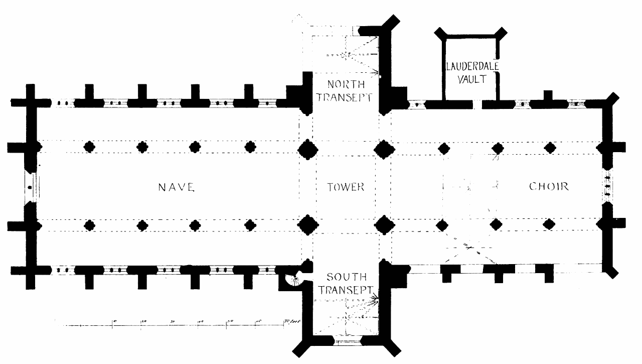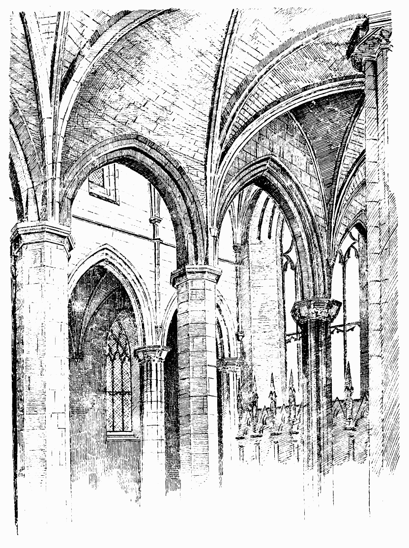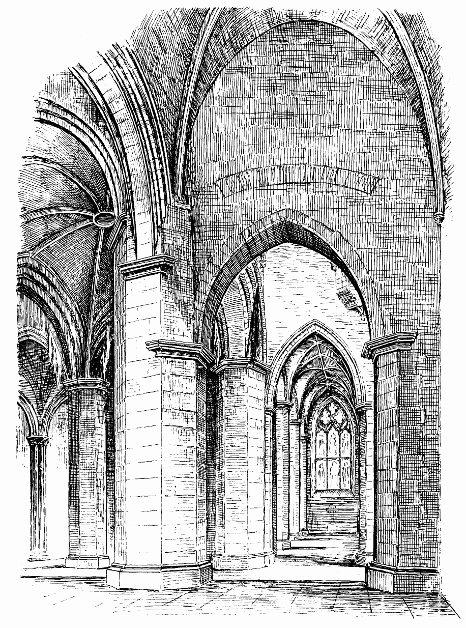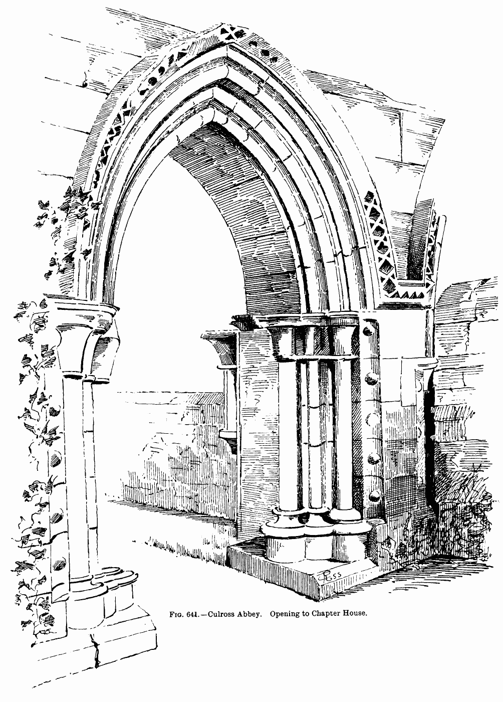 Probably one of the Scottish edifices in which Gothic principles are best exemplified is Melrose Abbey. The whole building was vaulted with stone, and the vaulting was chiefly groined. The ribs (see Fig. 767) descend on the caps of vaulting shafts of trefoil section, the central division of which rests on a corbel at the level of the main pier caps, while the other two divisions of the trefoil shaft descend without interruption to the base of the piers. That at least was the design, although it was in some of the piers interfered with by the introduction of a screen. In the south aisle also the vaulting ribs are carried on wall shafts or responds, which descend to the bases; but there is an unnecessary amount of wall on each side of these shafts and over the longitudinal arches, which lead into the outer chapels.