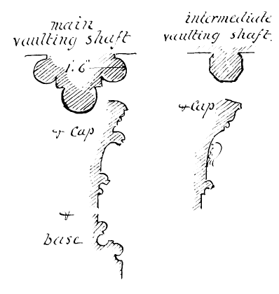 In some buildings, although vaulted, the wall shafts are of such slight dimensions as to be scarcely of any value (even to the eye) in conveying the weight of the vaults to the ground, and these shafts frequently do not descend to the base, or even to the caps of the main piers, but are carried on corbels inserted in the side walls at a considerable height above the caps of the piers. The functional use of the wall shafts is thus disregarded, and they become mere ornaments.