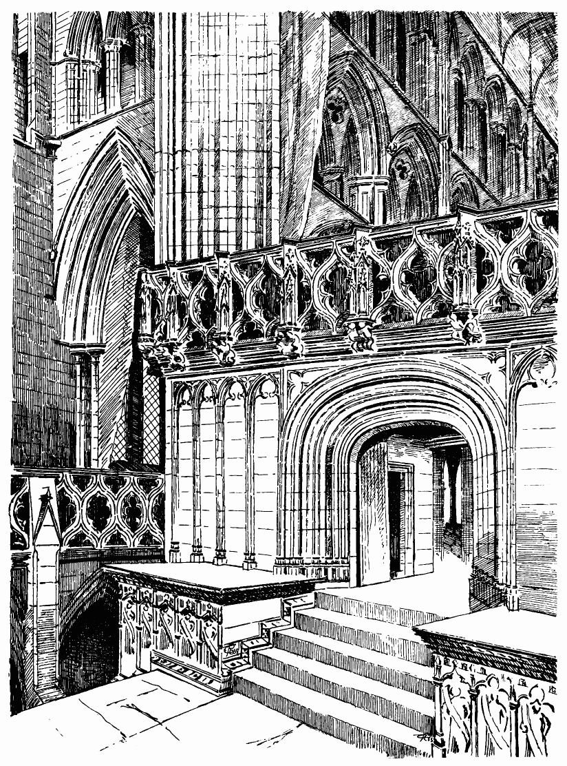According to Lord Bute’s view, a single great arch was thrown across the nave, between the second pillars from the crossing, above which was a gallery, where stood the royal{xviii} throne, surmounted by a baldaquin, having the altar of the crucifix behind it; while above the canopy towered the great rood, together with numerous figures. Lord Bute points, in support of this view, to the example at Frankfort, where an arch of a single span supported the rood loft and imperial and royal thrones.
