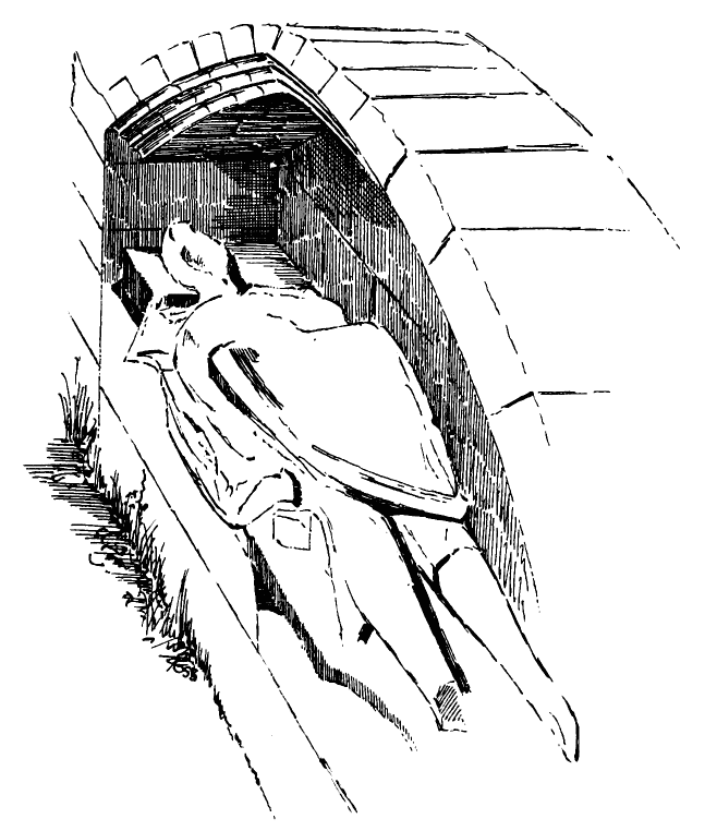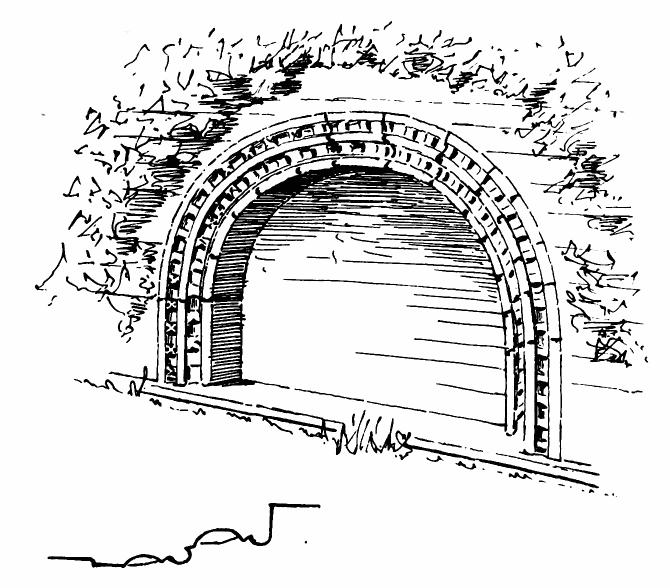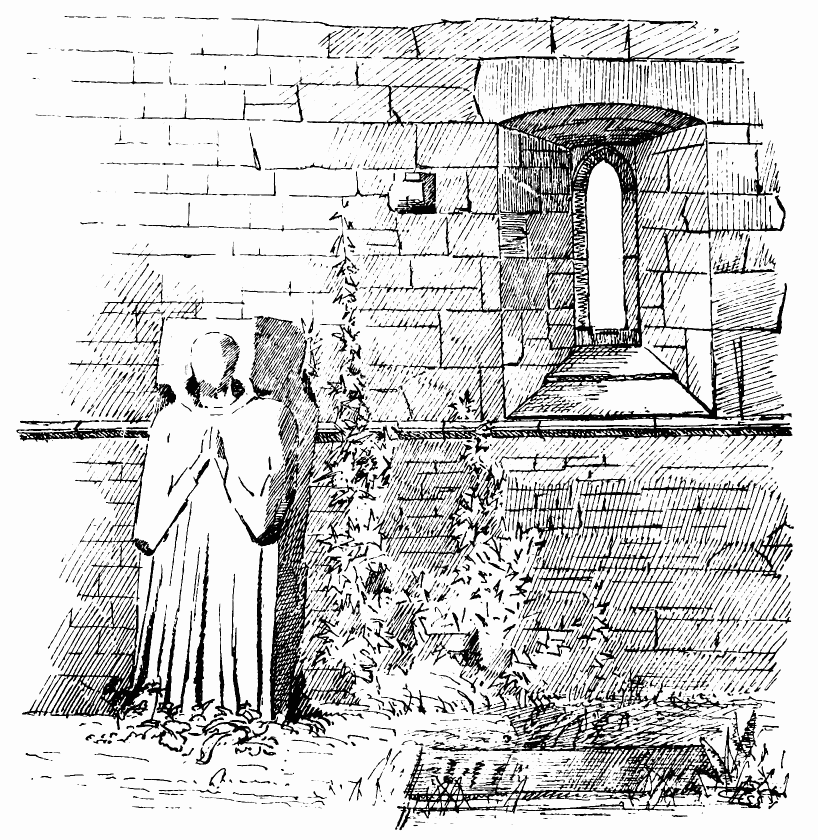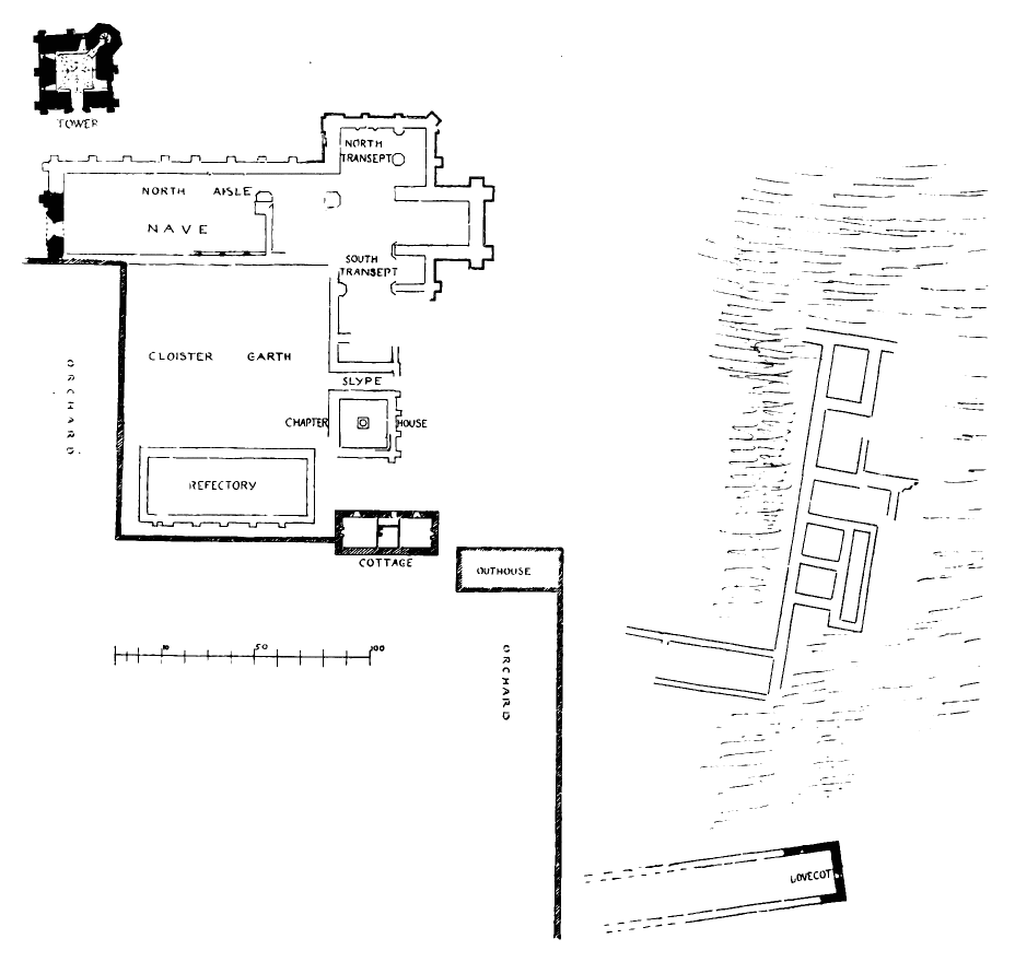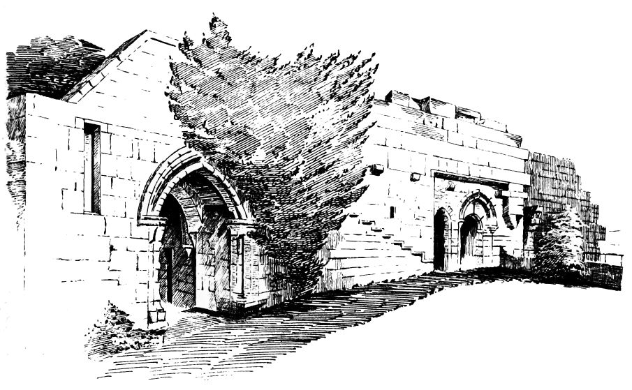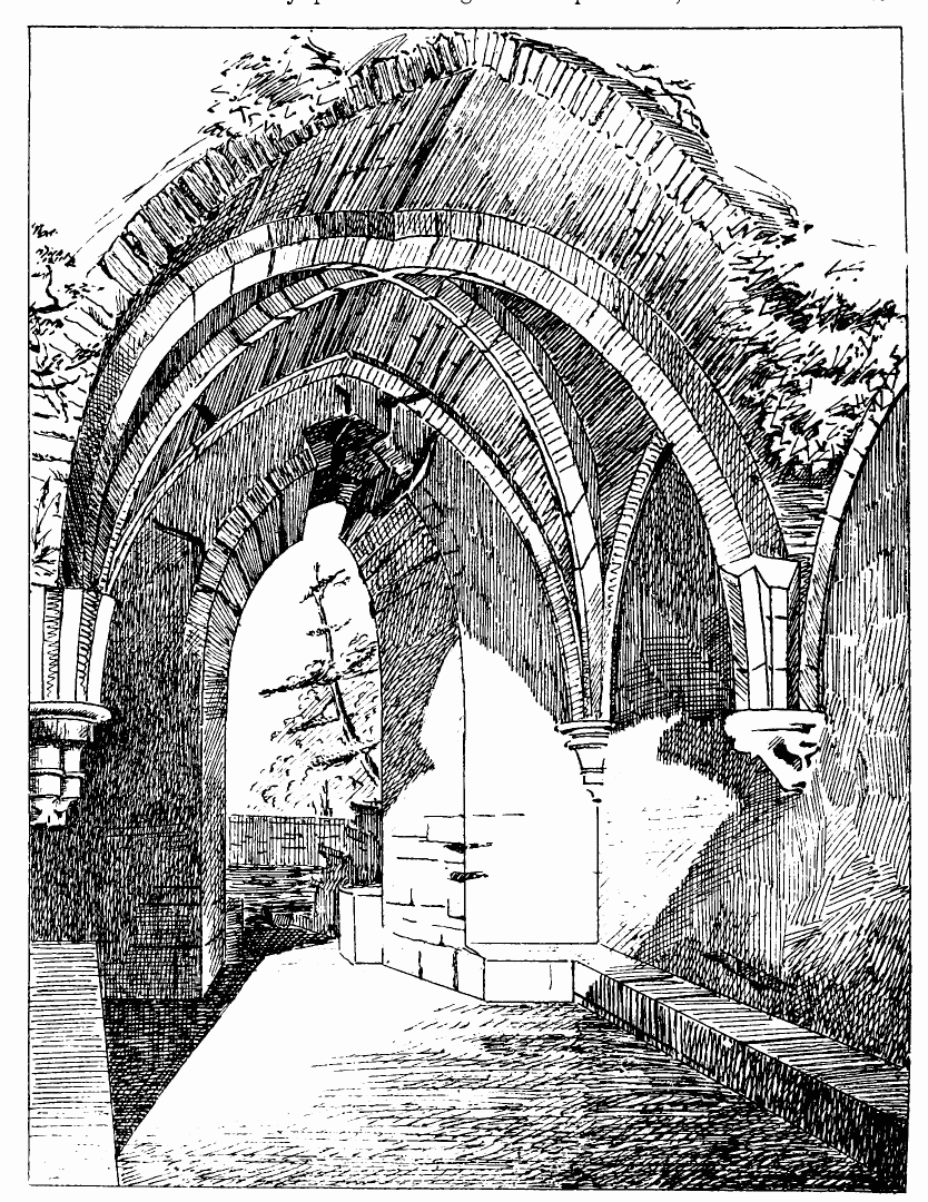 In the east range of buildings running south from the chapter house, the excavations have been continued, and the pillars of a vaulted chamber below the dormitory have been revealed. As this chamber contains a fireplace, it may possibly have been the day room or calefactory of the canons,{xiv} as only one fireplace (and that in the calefactory) was allowed in the monasteries. There is, however, some doubt as to whether this fireplace is original. At the south end of this chamber a deep drain or water channel, carefully built with ashlar, has been found. This was, doubtless, the main sewer of the monastery, through which there flowed a constant stream of water. The stream which fed the mill race (see Fig. 457) is not far distant. The latrines were, without doubt, situated above this sewer.