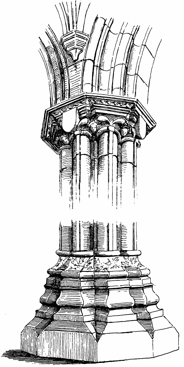 In France the abacus of the columns is invariably shaped so as to receive each shaft or rib which it is its function to carry; whereas the round abacus adopted in England receives indiscriminately all the members which descend upon it, and their loads are often carried by shafts not having any distinct or structural relation to the members which rest on the abacus above them.