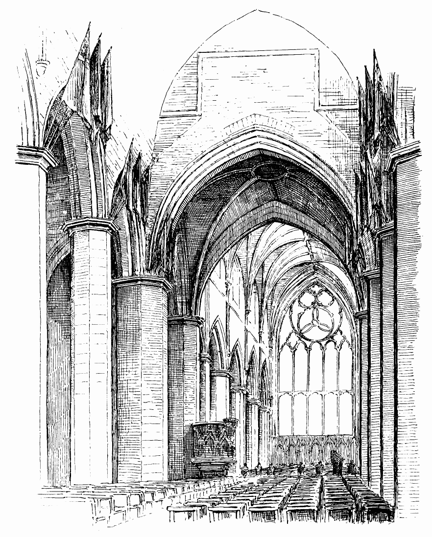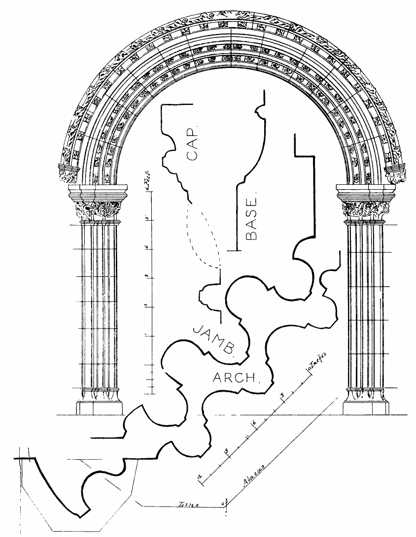 It was not till the end of the twelfth and during the thirteenth century that the Gothic system had been fully worked out by the French architects. The arcuated principle had then been developed in a complete and logical manner, and had entirely freed itself from the heavy and unnecessary mass of the earlier Romanesque. Nothing was preserved except the lightest framework required for stability, enclosed with screens of tracery filled with stained glass. Every detail of the fully developed Gothic style was designed on the same logical principles as the leading structural features, and gave expression in its design to the function it was required to fulfil,[2] while the whole building was so ornamented as to be in complete harmony with the general idea.[3]