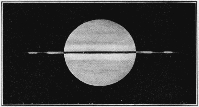 In the case of one of the planetary rings, its formation was so nearly homogeneous throughout that no aggregation into a single satellite was possible; all portions of the ring being of equal density, there was no denser region to attract the less dense regions, and in this manner the rings of Saturn were formed, in lieu of condensation into a separate satellite. Similarly in the case of the primal [371] solar ring that was detached next after the Jovian ring; there was such a nice balancing of masses and densities that, instead of a single major planet, we have the well-known asteroidal ring, composed of innumerable discrete minor planets.