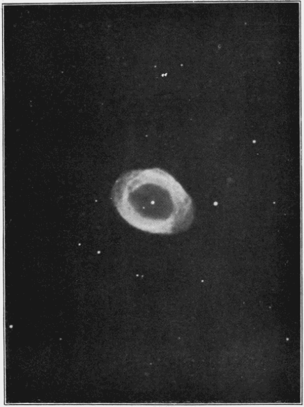 Another class of these objects are the annular and elliptic nebulæ which are not very abundant. The southern constellation Grus, the crane, contains a fine one, but by far the best example is in the constellation Lyra. It is a nearly perfect ring, elliptic in figure, exceedingly faint in small telescopes; but large instruments reveal many stars within the annulus, one near the center which, although very faint to the eye, is always an easy object on the photographic plate, because it is rich in blue and violet rays. The parallax of the ring nebula in Lyra comes out only one-sixth of that of the planetary nebulæ, and the least greatest diameters of this huge continuous ring are 250 and 330 times the orbit of Neptune.