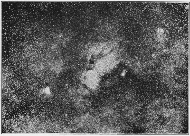 It is now pretty generally believed that many of the dark regions of the Milky Way are due not to actual absence of stars so much as to the absorption of light by intervening tracts of nebulous matter on the hither side of the Galactic aggregations [355] and, probably in fact, within the oblate inner stellar system itself. Easton has made many hundred counts of stars in galactic regions of Cygnus and Aquila where the range of intensity of the light is very marked; in fact, the star density of the bright patches of the Galaxy is so far in excess of the density adjacent and just outside the Milky Way, that the conclusion is inevitable that this excess is due to the star clouds.