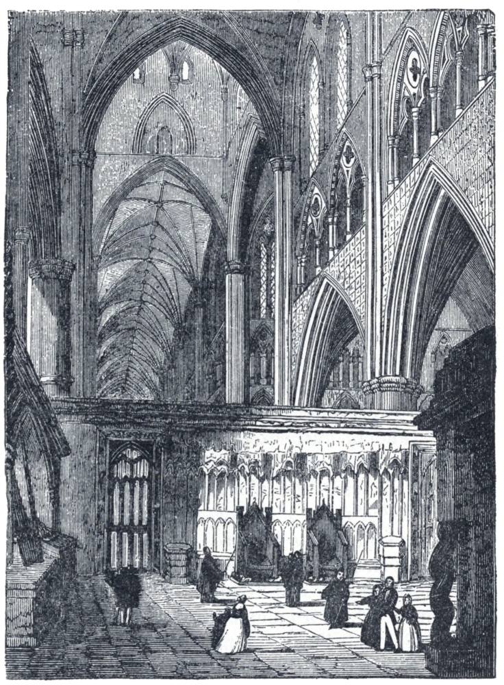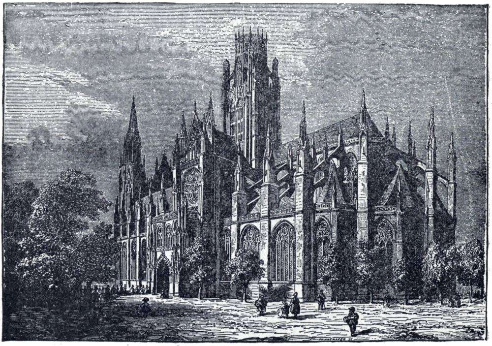 Though it may not be so huge in its dimensions as the other three, it certainly cannot be excelled in beauty of design or artistic excellence in construction. It is cruciform in shape, with a total length of one hundred and forty-eight yards, and sixty-seven yards breadth. Its walls are one hundred and fifty feet high, the roof two hundred and one feet, and the tower over the transept three hundred and fifty-seven feet, and the two towers over the west façade two hundred and fifty feet high.