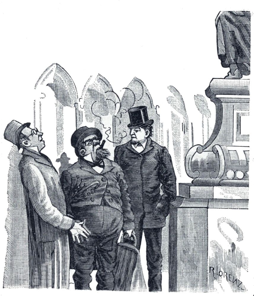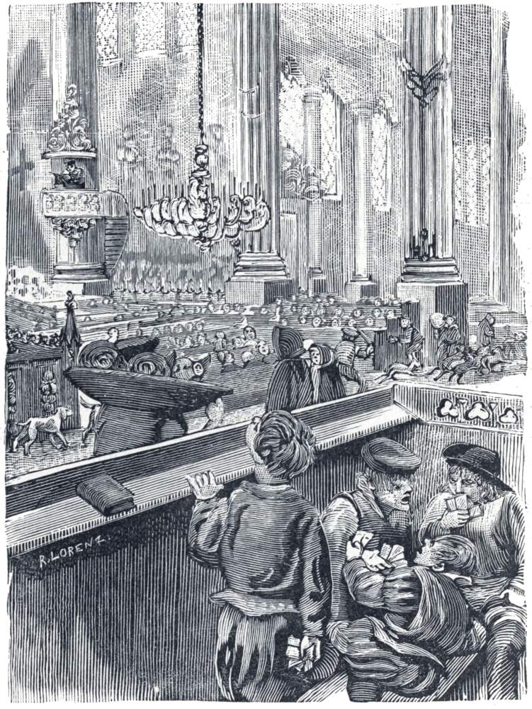 “Cathedrals in Europe,” said he, “and even the churches in our own beloved country, are always the darkest, gloomiest places that human ingenuity can possibly devise. I remember the one my grandmother used to compel me to attend when I was a boy of six. The interior, even to the pews, and their furnishings were of a dark and dismal color, the hen-coop pulpit was dark, the trimmings about it were dark, the windows were narrow and very high up. The ceiling was dark, and to add to the prevailing gloominess, there were outside green blinds over the windows that admitted just enough light to make the gloom of the interior felt. And then the domine was a sallow man with gray hair, brushed back from his forehead; and he dressed in a black frock coat buttoned up to his chin. He was the least cheerful picture in the church.