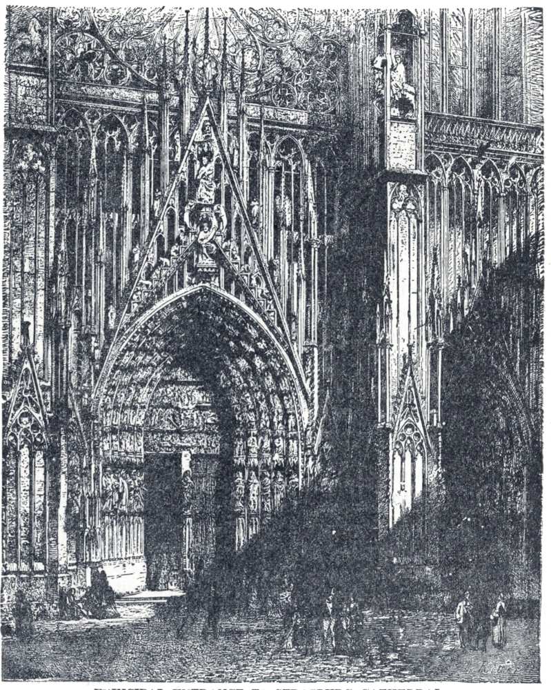 The history of this cathedral, which has been building since 1248, is somewhat interesting to those who take any interest in cathedrals. The foundation stone was laid on the twenty-fourth of August, 1248, by Archbishop Conrad, of Hechstaden, but it was a number of years before anything more was done. In 1322 the choir was finished and consecrated. In 1388 the nave was fitted up for use, and in 1447 the bells were placed in the south tower. From that time the interest in the work gradually died out, and it seemed as though the original design would never be carried out. In 1796 the French took off the lead roof that had been placed over the decaying building, and converted it into a hay magazine.