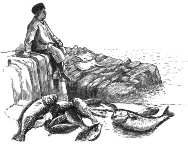 After several sweet lazy hours, we went through a "fish-cellar," a little group of cottages, and climbed a headland, to take our veritable farewell of the Land's End, and then decided to go home. We had rolled or thrown our provision basket, rugs, &c., down the sandy slope, but it was another thing to carry them up again. I went in quest of a small boy, and there presented himself a big man, coastguard, as the only unemployed hand in the place, who apologised with such a magnificent air for not having "cleaned" himself, that I almost blushed to ask him to do such a menial service as to carry a bundle of wraps. But he accepted it, conversing amiably as we went, and giving me a most graphic picture of life at Sennen during the winter. When he left me, making a short cut to our encampment—a black dot on the sands, with two moving black dots near it—a fisher wife joined me, and of her own accord began a conversation.