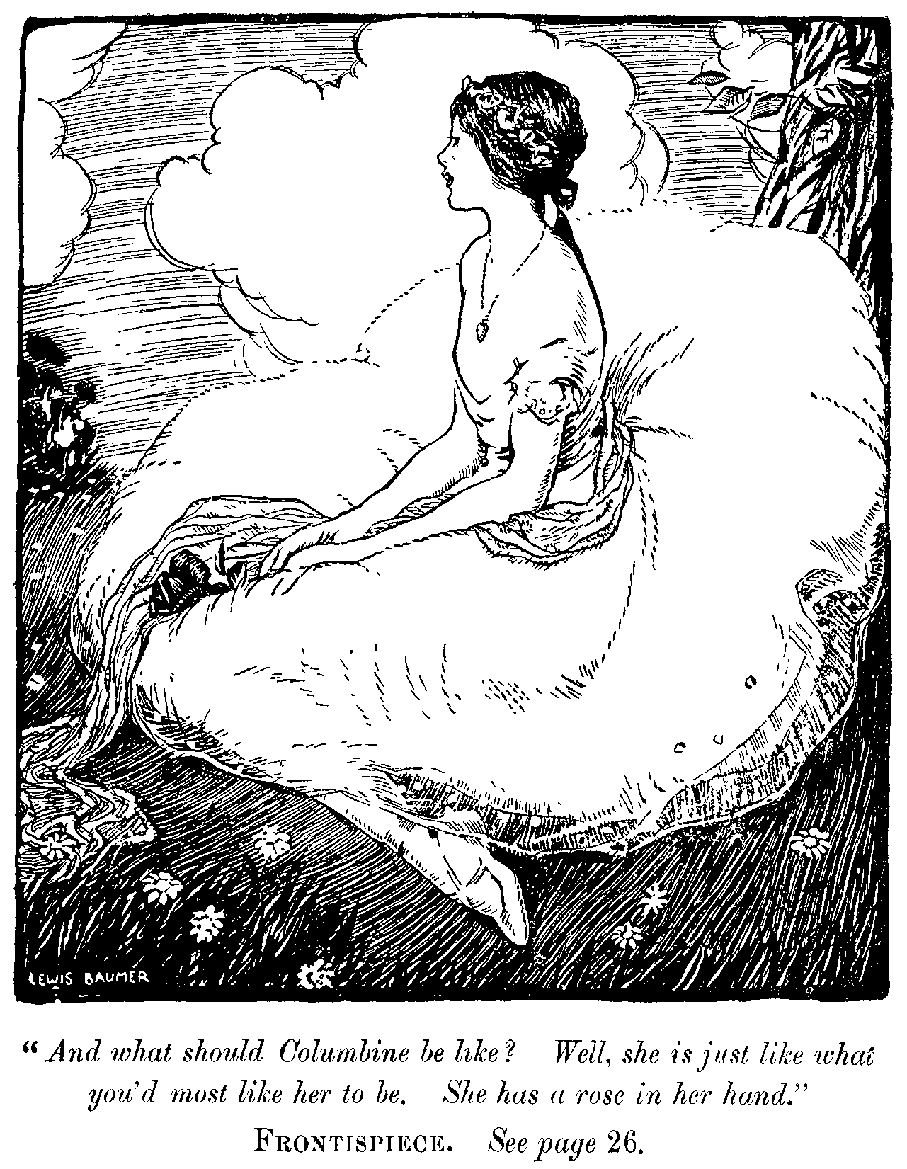 Alice.. Well, she is a perfect darling. But you don't see her in the first scene. Now Psyche, who is the Soul, comes down ... whenever a baby's born, of course, a little scrap of Psyche is sent down! ... But this is how the story goes ... That she comes down from Mount Olympus where the gods live to adventure on the earth. And in the Harlequinade she's Columbine, but that only means a dove, and a dove is the symbol of the soul. And anybody who is fond of flowers knows that, because if you look at Columbine flowers you can see that they are made of doves with their wings out. And so she ought always to be dressed in blue.