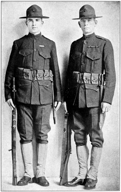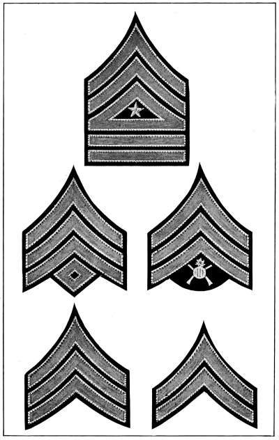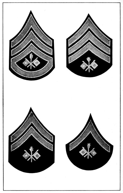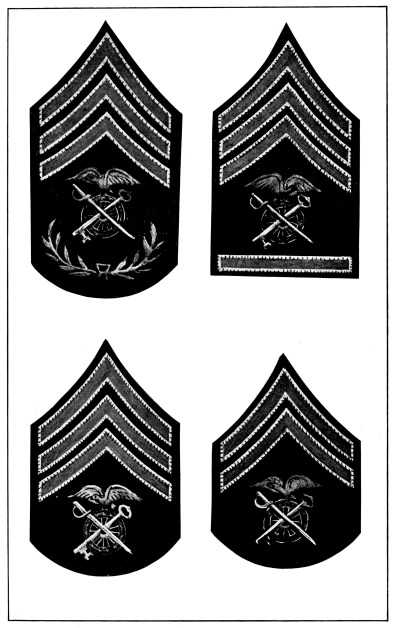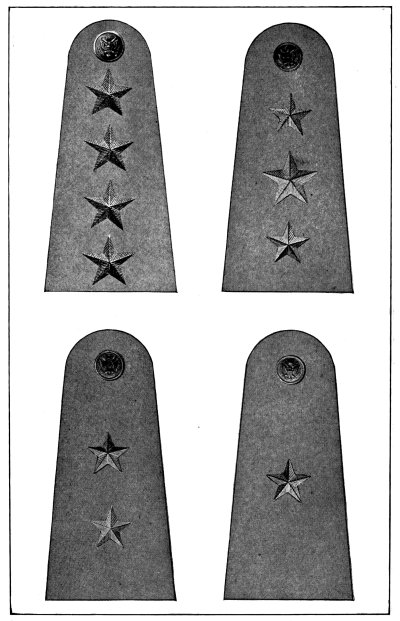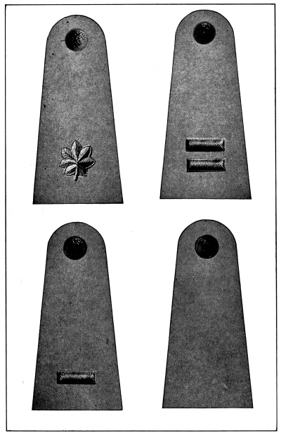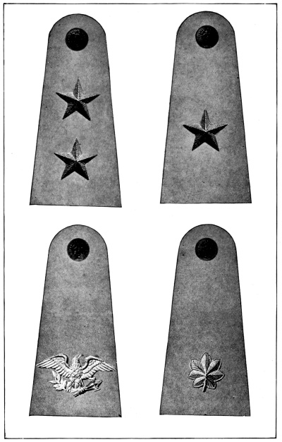 In the United States Army and Marine Corps the prevalent color for the field service uniforms is some shade of the dull brown commonly known as “khaki,” and the bright gilt and silver buttons, corps and regimental devices and numbers and belt buckles have been replaced to a great extent by dull bronze buttons and ornaments, insignia of rank for officers only being still made of silver and gold. [Pg 12]