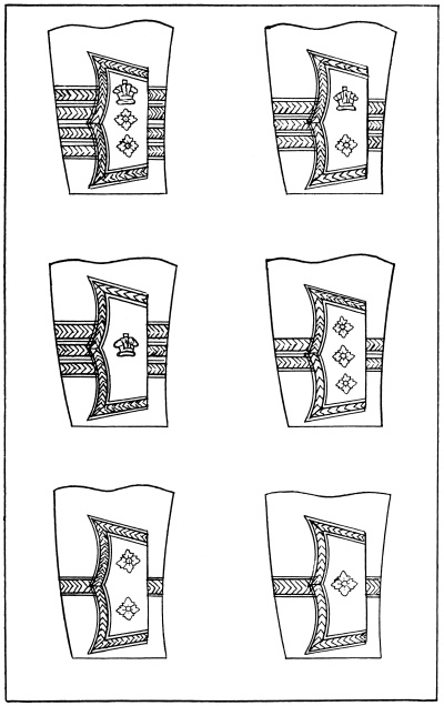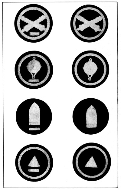 As time went by the leaders in command of the land forces perceived the necessity for some mark or badge to designate the members of their forces and to distinguish them from the foe. This resulted in the use of various distinctive badges, such as plumes of a certain color to be worn upon the helmet, initials, numbers or devices in the nature of a coat of arms to be worn upon the front of the helmet, on the breast plate of armor, on the tops of the shoulders or upon the shield, a custom which still prevails in the armies of to-day.