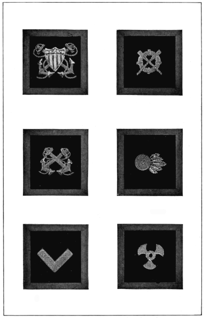 The great Civil War called such large bodies of men to the colors of the two contending sides that the question of economy demanded that the service uniforms for each side be made of one standard color and style, the armies of the North wearing blue and those of the South wearing gray. In each army, however, the different corps were distinguished by a distinctive color for the trimmings or “facings,” a custom which still prevails for the dress uniforms of our troops.
