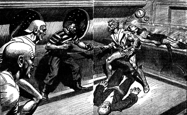 The pseudo-chief's gun spoke first, and the head and shoulders of the other disappeared in a burst of flame and sickening smoke. There was no time for delicacy. Ruthlessly shoving the seared corpse away, the stranger dove for the controls, touched the jet keys.