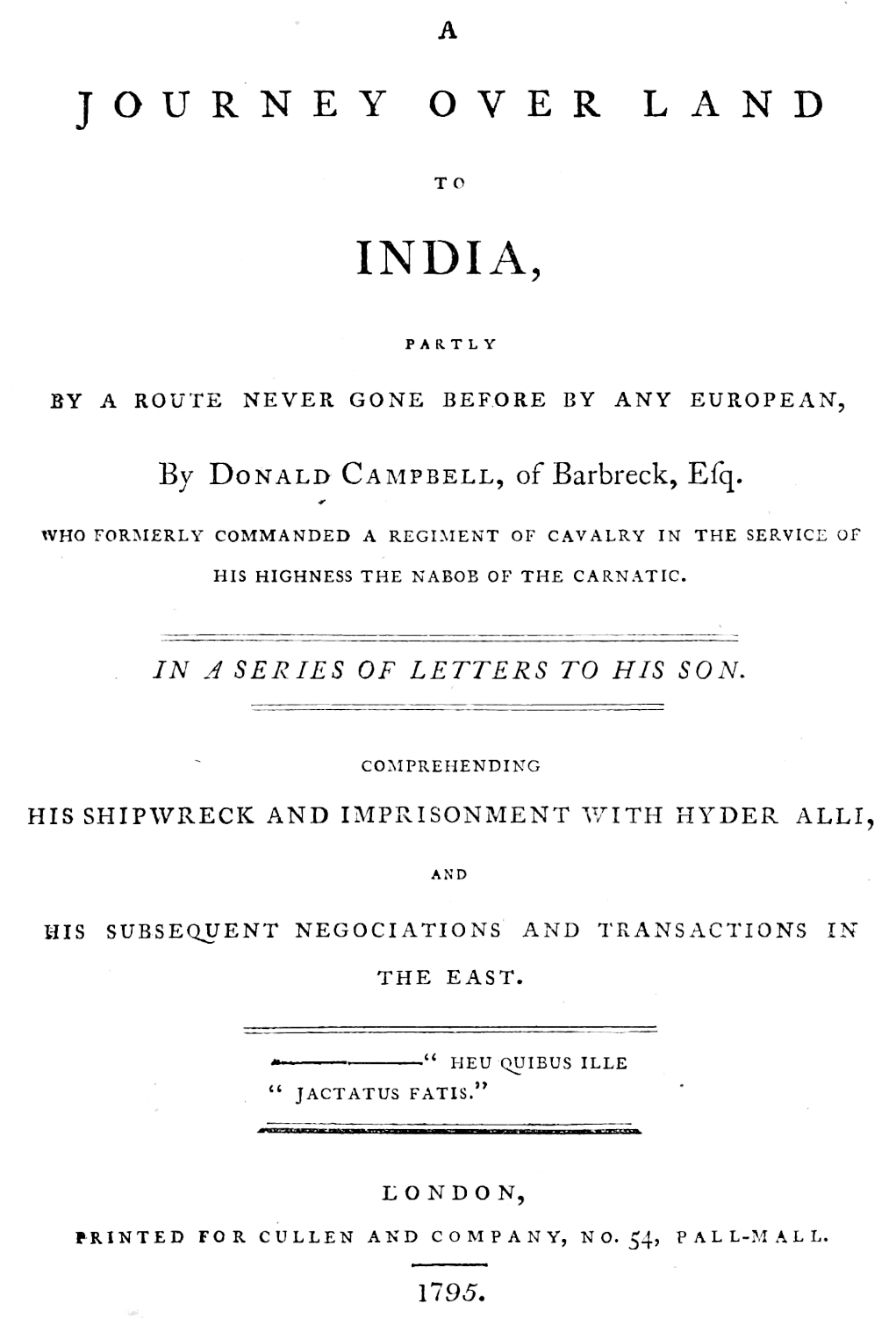The tenderness of a fond father’s heart admonishes me, that I should but poorly requite the affectionate solicitude you have so often expressed, to become acquainted with the particulars of my journey over land to India, if I any longer withheld from you an account of that singular and eventful period of my life. I confess to you, my dear boy, that often when I have endeavoured to amuse you with the leading incidents and extraordinary vicissitudes of fortune which chequered the whole of that series of adventures, and observed the eager attention with which, young though you were, you listened to the recital, the tender sensibility you disclosed at some passages, and the earnest desire you 2expressed that “I should the whole relate,” I have felt an almost irresistible impulse to indulge you with an accurate and faithful narrative, and have more than once sat down at my bureau for the purpose: but sober and deliberate reflection suggested that it was too soon, and that, by complying with your desire at such a very early period of your life, I should but render the great end that I proposed by it abortive, frustrate the instruction which I meant to convey, and impress the mere incident on your memory, while the moral deducible from it must necessarily evaporate, and leave no trace, or rather excite no idea, in a mind not sufficiently matured for the conception of abstract principles, or prepared by practice for the deduction of moral inferences.