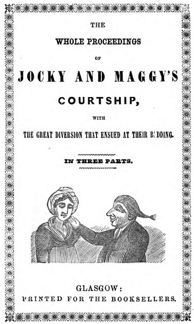 The incidents of Dougal’s official life being committed[17] to the keeping of tradition, have faded out of public memory with the generation whose sides were tickled by his jokes; but a list of his chap-books made by Motherwell, lets us see how he employed his literary leisure, and the date of publication of the last but one on the list, brings us to the date of his exit from the scene which his pen and his voice helped so much to enliven. It is generally agreed that “Jockie and Maggie’s Courtship” is the first of his original prose compositions; and that it was written some time after his having set up in business as a printer. He appears to have previously devoted his pen entirely to the service of the poetic muses; and is the originator of those comic, but harmless satires on the simplicity and imperfect English of Highlanders, of which his John Hielandman and Turnimspike are the prototypes. But, like his greater countryman, and it may be added, his greatest extinguisher, Scott—and much about the same age—after he had worked out the poetic vein, he discovered a prose one, equally prolific, and of richer ore; but of which, like the “Great Unknown,” he preferred to be the unknown excavator. It is an odd coincidence that, like Scott, too, he frequently wrote under cognomens, as John Falkirk, or The Scots Piper. The following is Motherwell’s list of his prose tracts, with the dates of the earliest editions which he was able to obtain:—Leper the Tailor, Part II. only, being a first edition.