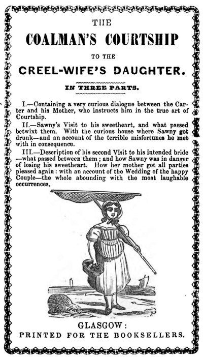 1. Jockie and Maggie, five parts, 1783; 2. Paddy from Cork, 1784; 3. Lothian Tom, six parts, 1793;[18] 4. John Cheap (The Chapman), three parts, 1786; 5. John Falkirk, 1779; 6. John Falkirk’s Cariches; 7. Janet Clinker’s Orations; sometimes published under the title of Granny M’Nab’s Lectures in the Society of Clashing Wives; 8. Leper the Tailor, parts I. and II., 1779; 9. Simple John and His Twelve Misfortunes. Motherwell is of opinion that George Buchanan, The Coalman’s Courtship, and the History of Buckhaven, are his also; and questions the existence of any of them before his time. These three are also found attributed to him by M’Vean, a Glasgow antiquarian bookseller, in a MS. list of Dougal’s publications quoted by Dr Strang,[A] which, in addition to those in Motherwell’s list, contains: The History of the Haverel Wives, The Grand Solemnity of the Tailor’s Funeral, &c.; The Remarkable Life and Transactions of Alexander Hamwinkle, &c.; The Dying Groans of Sir John Barleycorn, &c.; A Warning to the Methodist Preachers; A Second Warning to the Methodist Preachers. Mr Fraser, who has, perhaps, given more consideration to the subject than any of his predecessors, besides having the benefit of their labours,[B] gives a classified list of his publications under four heads.