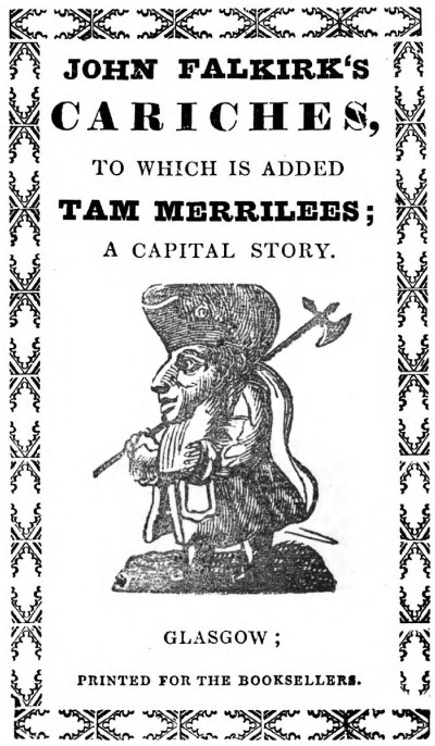 Of Dougal’s personal appearance some particulars have been already noted, but an edition of John Falkirk’s Cariches, which appeared soon after his death, contains a prefatory notice, in which, under the cognomen of John Falkirk, commonly called the Scots Piper, the popular contemporary ideal of him is given as “a curious, little, witty fellow, with a round face and a broad nose. None of his companions could answer the many witty questions he proposed to them—therefore he became the wonder of the age in which he lived. Being born of mean parents, he got no education; therefore, his witty invention was truly natural; and being bred to no business, he was under the necessity of using his genius in the composition of several small books, of which the following Cariches was one, which he disposed of for his support.”