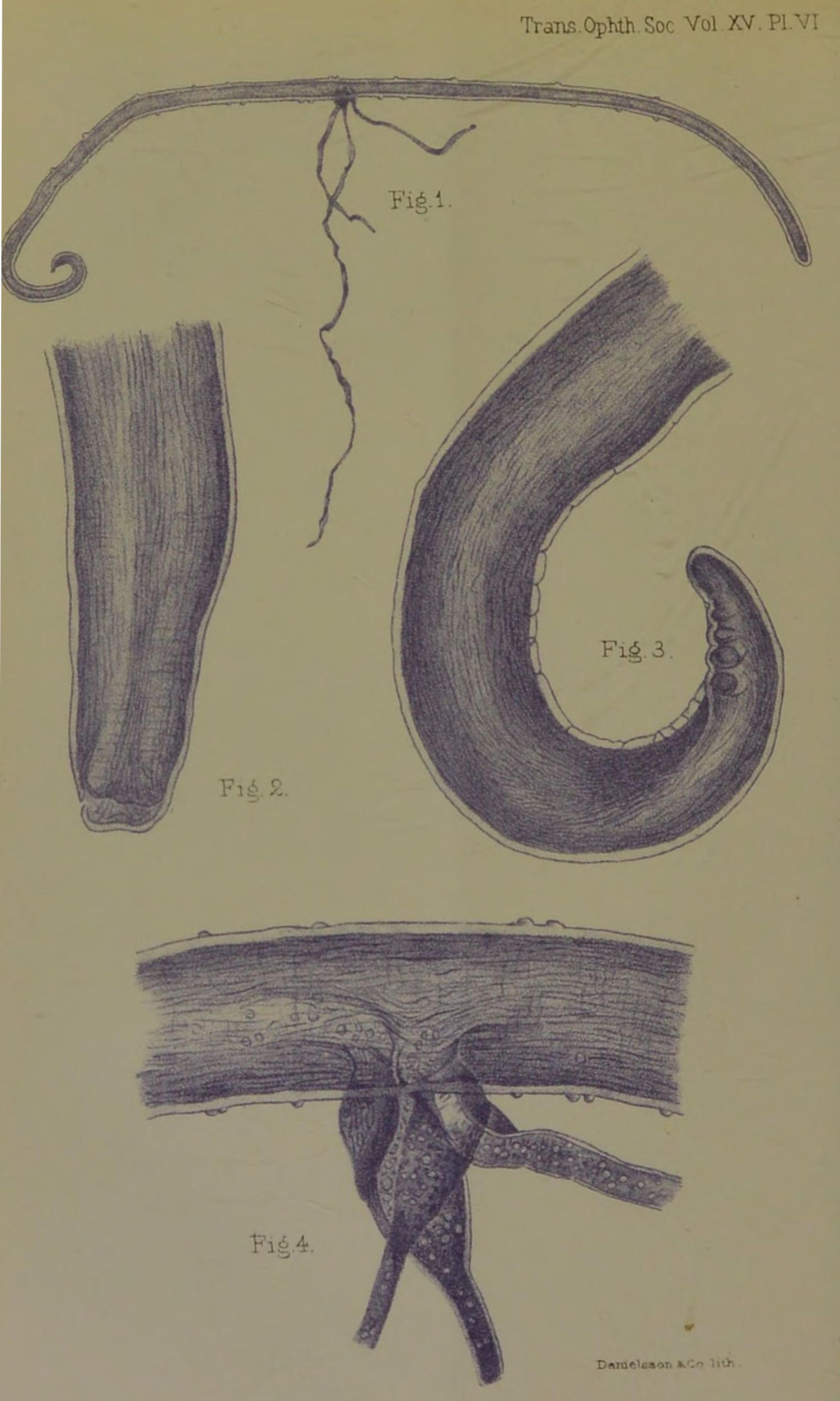 As in the case of my patient, Mrs. H⸺ noticed that the worms scarcely troubled her at all during winter. It was only in warm weather they were lively. Both ladies occasionally noticed that the worm lay for a short time coiled up and motionless under the conjunctiva. When the worm appeared on the surface Mrs. H⸺ experienced a “biting, nibbling sensation” at the part where the worm was, and the eye became tender and watery, so that she had to keep it closed, but it never produced any severe inflammation. When not under the conjunctiva or skin she was not aware of its presence.