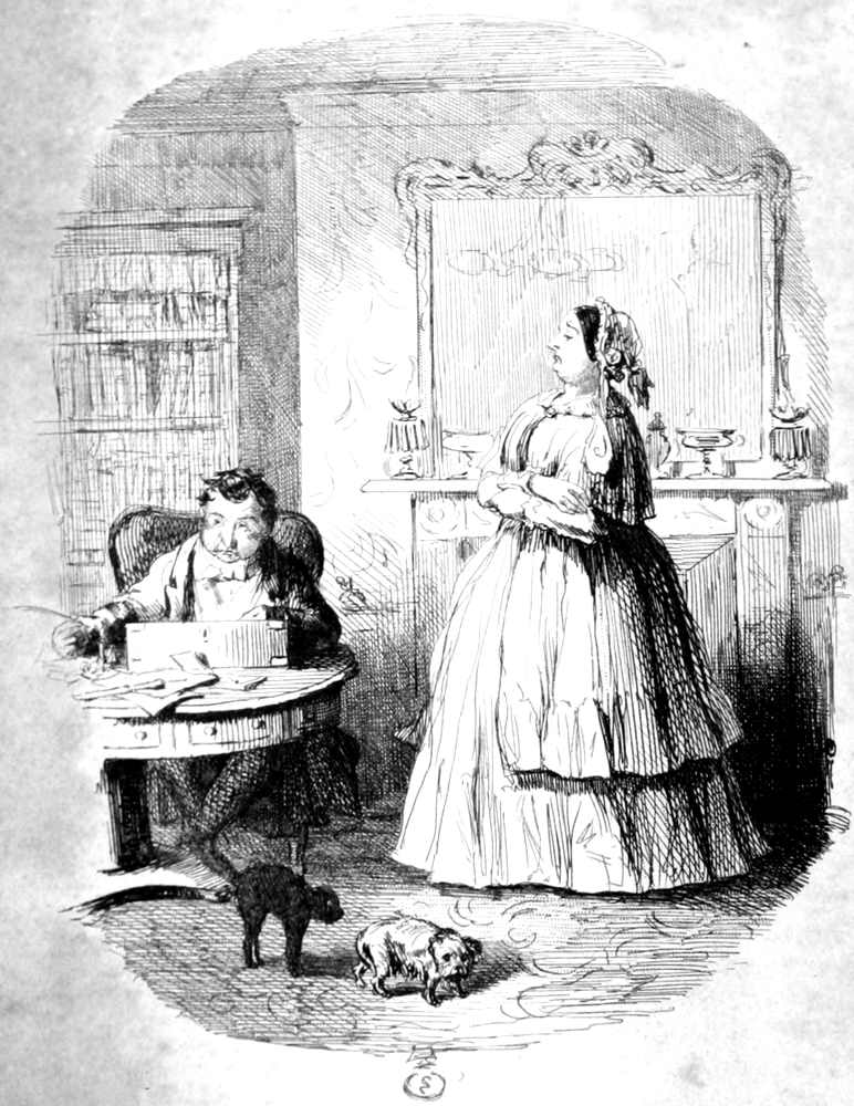 This curious question was coldly put by a gentlewoman in morning undress to a man in gown and slippers. The reader, who is always permitted to wear the old cloak of the old stage mystery—the cloak that maketh invisible—must at once perceive the tender relation that lives and flourishes between the interesting person who puts this familiar interrogative, and the being who suffers it. They are man and wife. The marriage certificate is legible in every line of Mrs. Jericho’s face. She asks for money with a placid sense of right; it may be, strengthened by the assurance that her debtor cannot escape her. For it is a social truth the reader may not have overlooked, that if a man be under his own roof, he must be at home to his own wife.