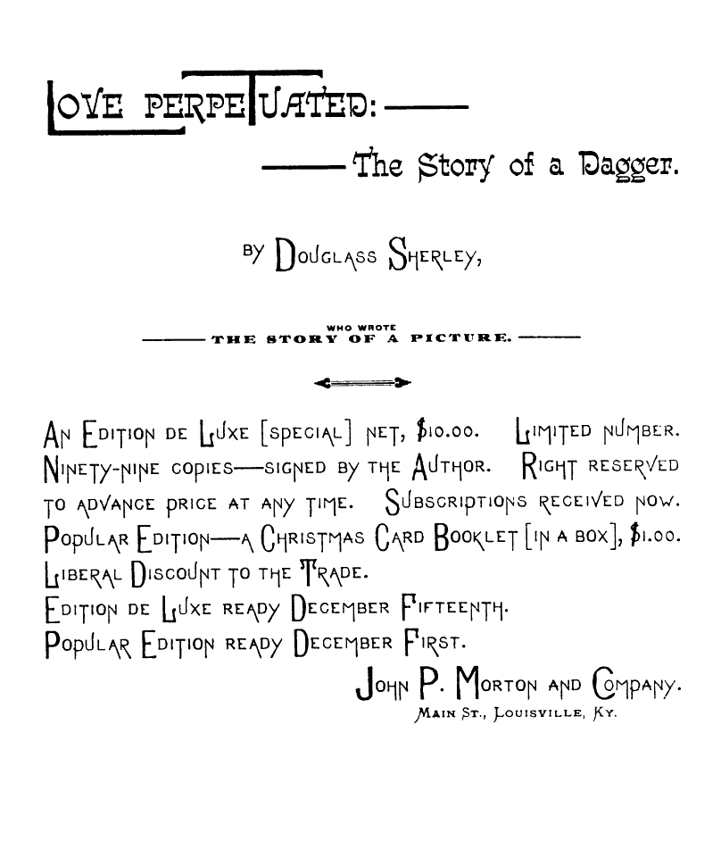 An Edition de Luxe [special] net, $10.00. Limited number. Ninety-nine copies—signed by the Author. Right reserved to advance price at any time. Subscriptions received now. Popular Edition—a Christmas Card Booklet [in a box], $1.00. Liberal Discount to the Trade.