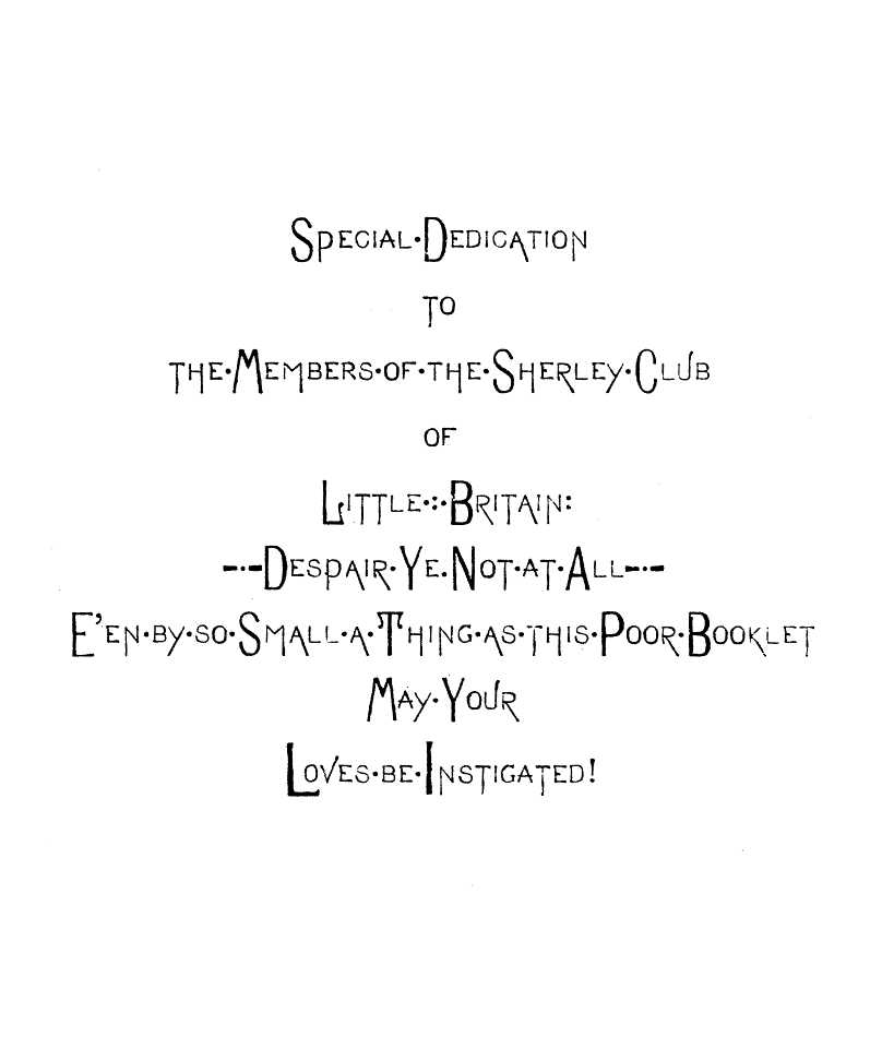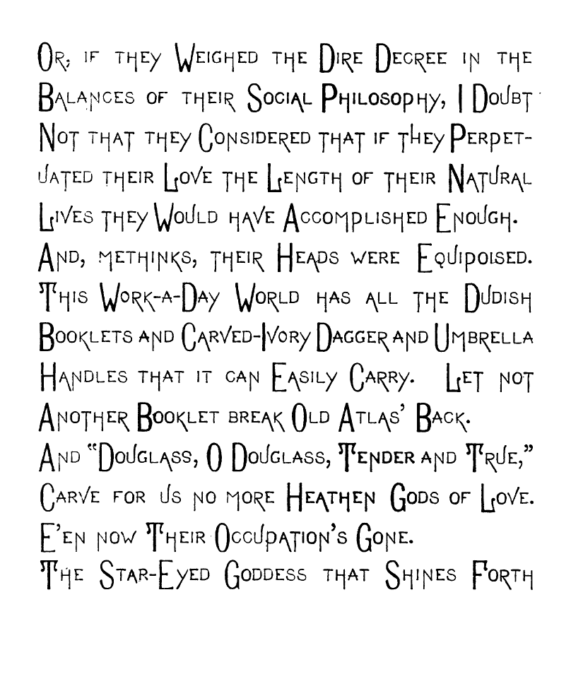 Or, if they Weighed the Dire Decree in the Balances of their Social Philosophy, I Doubt Not that they Considered that if they Perpetuated their Love the Length of their Natural Lives they Would have Accomplished Enough. And, methinks their Heads were Equipoised. This Work-a-Day World has all the Dudish Booklets and Carved-Ivory Dagger and Umbrella Handles that it can Easily Carry. Let not Another Booklet break Old Atlas' Back.