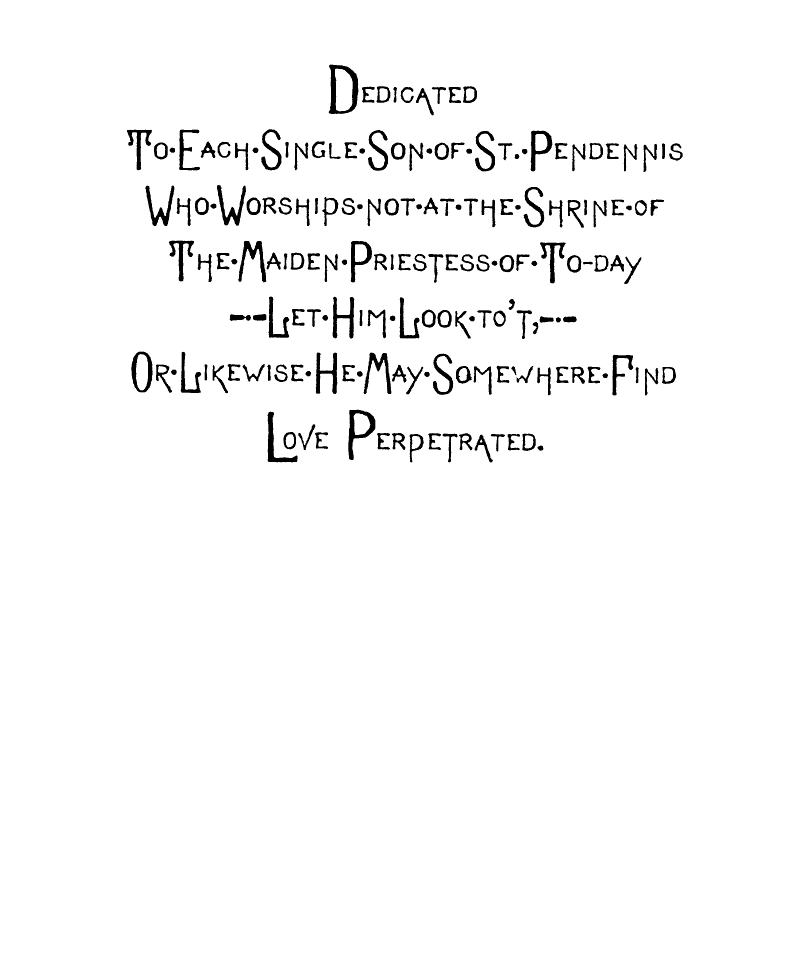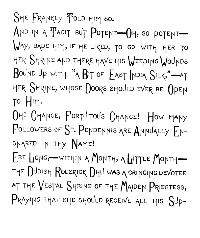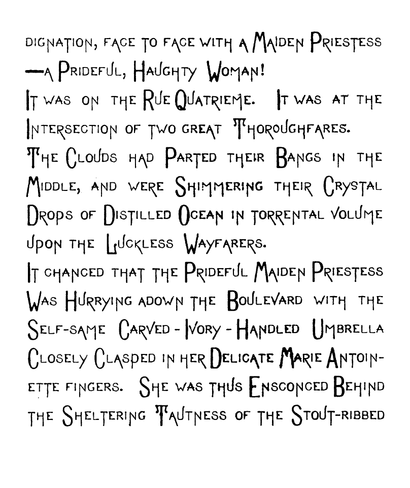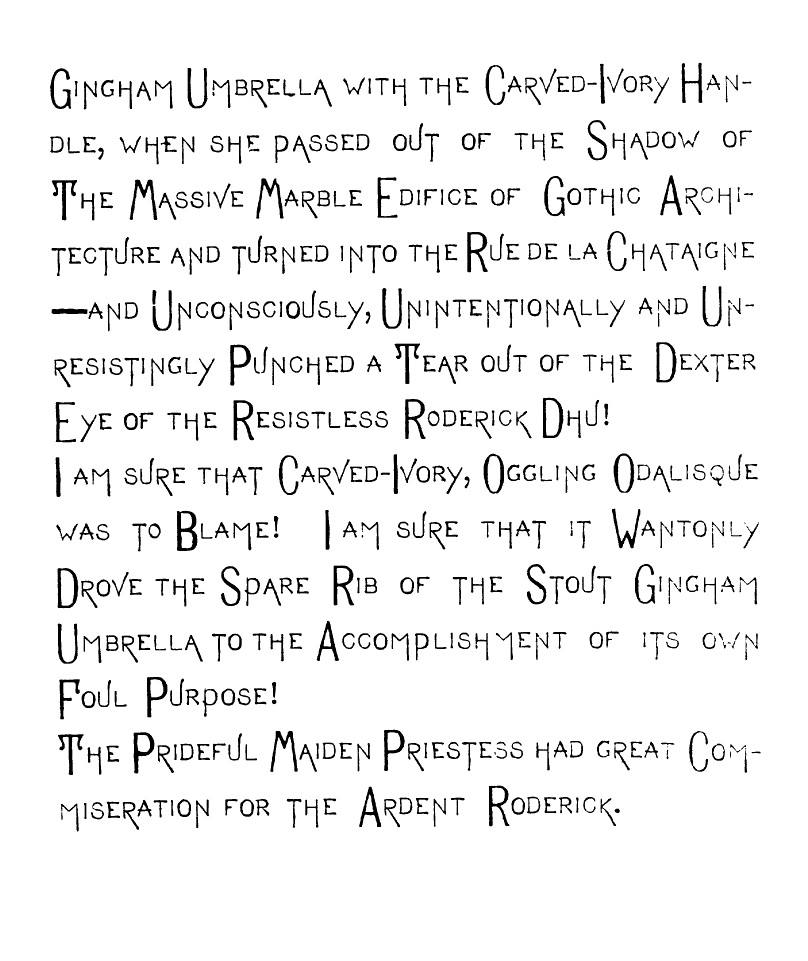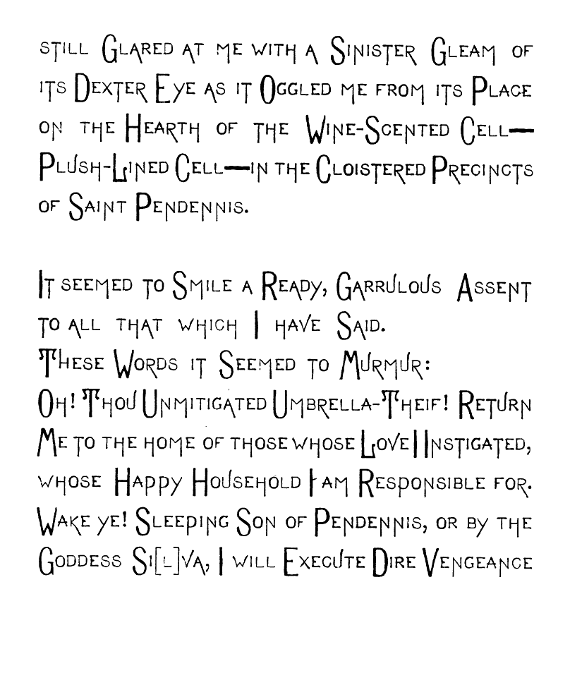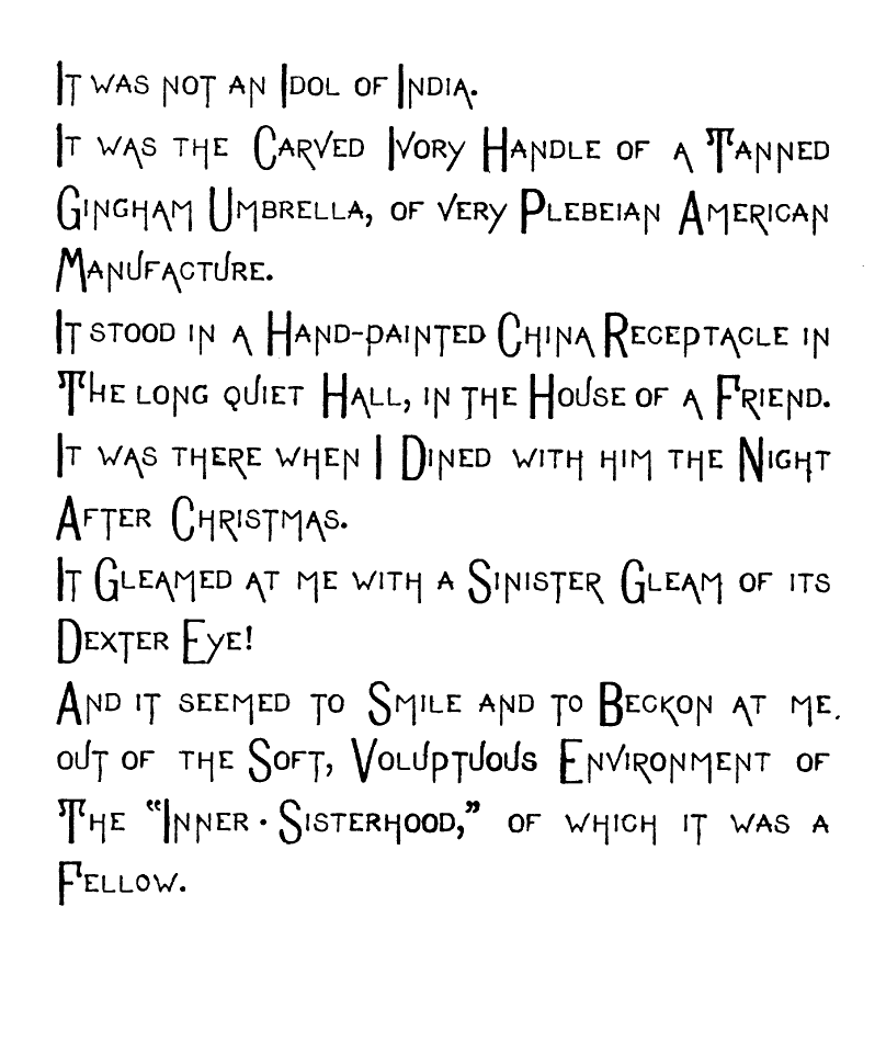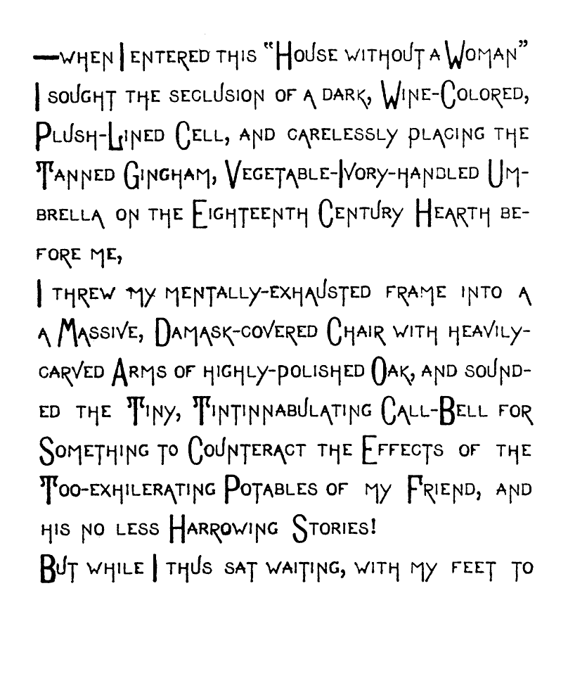 But,—Oh Fitful Fate!—as I passed though The Long, Quiet Hall and by the wine-colored Plush Corner from whose Voluptuous Shadow The Sinister-Eyed, Carved-Ivory-Handle Odalisque [img] cast an Alluring, Appealing Look toward Me, and all Unconsciously, Unintentionally, and Unresistingly I Took it from its Hand-Painted China Receptacle, and closing the Heavy doors of Rolled, Cathedral Plate Glass After me, I Unfurled its Sun-Tanned Gingham Folds to the aforementioned warring elements. And as I Wended my Desolate Way to the Sainted Shrine of Pendennis, my Seething Brain Peopled the Valley of Unrest with Elfs, And Ravens and Brahman Gods, and the Dagger whose blood-stain belonged to a Venetian Duke. When I Presently Entered the Resounding Cloisters of the Order of ST. PENDENNIS—when [img] I entered this "House without a Woman" I sought the seclusion of a dark, Wine-Colored, Plush-Lined Cell, and carelessly placing the Tanned Gingham, Vegetable-Ivory-handled Umbrella on the Eighteenth Century Hearth before me,