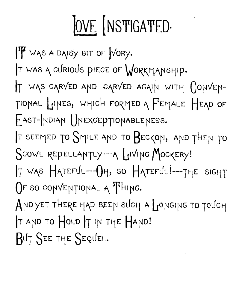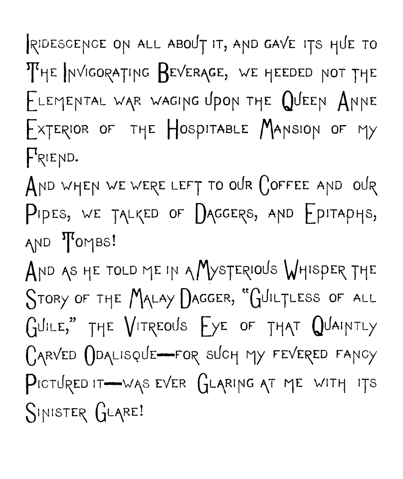 And as he told me in a Mysterious Whisper the Story of the Malay Dagger, "Guiltless of all Guile," the Vitreous Eye of that Quaintly Carved Odalisque—for such my fevered fancy Pictured it—was ever Glaring at me with its Sinister Glare!