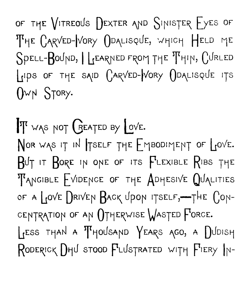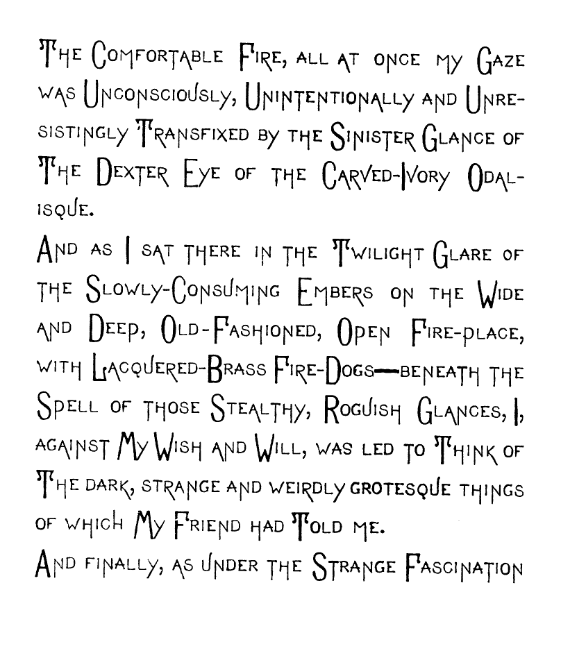 And finally, as under the Strange Fascination [img] of the Vitreous Dexter and Sinister Eyes of The Carved-Ivory Odalisque, which Held me Spell-Bound, I Learned from the Thin, Curled Lips of the said Carved-Ivory Odalisque its Own Story.