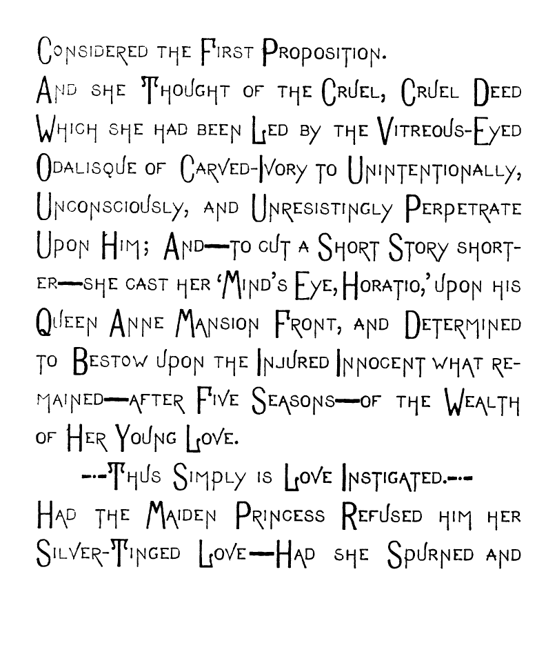 And she Thought of the Cruel, Cruel Deed Which she had been Led by the Vitreous-Eyed Odalisque of Carved-Ivory to Unintentionally, Unconsciously, and Unresistingly Perpetrate Upon Him; And—to cut a Short Story shorter—she cast her 'Mind's Eye, Horatio,' upon his Queen Anne Mansion Front, and Determined to Bestow upon the Injured Innocent what remained—after Five Seasons—of the Wealth of Her Young Love.