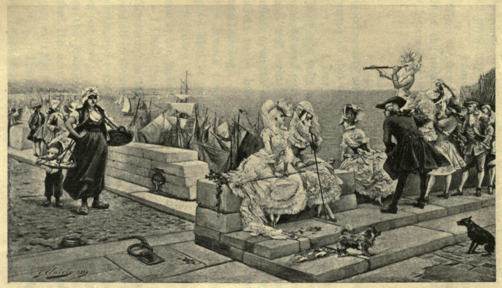 The glance thus obtained into the Bath itself only gives, as it were, a momentary view of the fashionable people in those fashionable waters. They who compare old accounts with what is now to be seen will agree that he who looks, at the present day, into the dull, dark, and simmering waters can have no conception of the jollity, frolic, riot, dissipation, and indecorum which once reigned there. There was a regular promenade in the waters, and the promenaders were of both sexes. They were in bathing-costumes, and walked with the water nearly up to their necks. The heads of the shorter people appeared to be floating. At the same time, they were frolicking, or flirting, or otherwise amusing themselves. Those who came for sanitary purposes were hanging on by the rings in the wall, and were sedulously parboiling themselves. The Cross Bath was the famous quality bath. Handsome japanned bowls floated before the ladies, laden with confectionery, or with oils, essences, and perfumery for their use. Now and then one of these bowls would float away from its owner, and her swain would float after it, bring it again before her, and, if he were in the humour, would turn on his back and affect to sink to the bottom, out of mere rapture at the opportunity of serving her. The spectators in the gallery looked on, laughed, or applauded till the hour for closing came. Therewith came half-tub chairs, lined with blankets, whose owners plied for fares, and carried home the[17] steaming freight at a sharp trot and a shilling for the job.