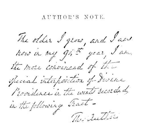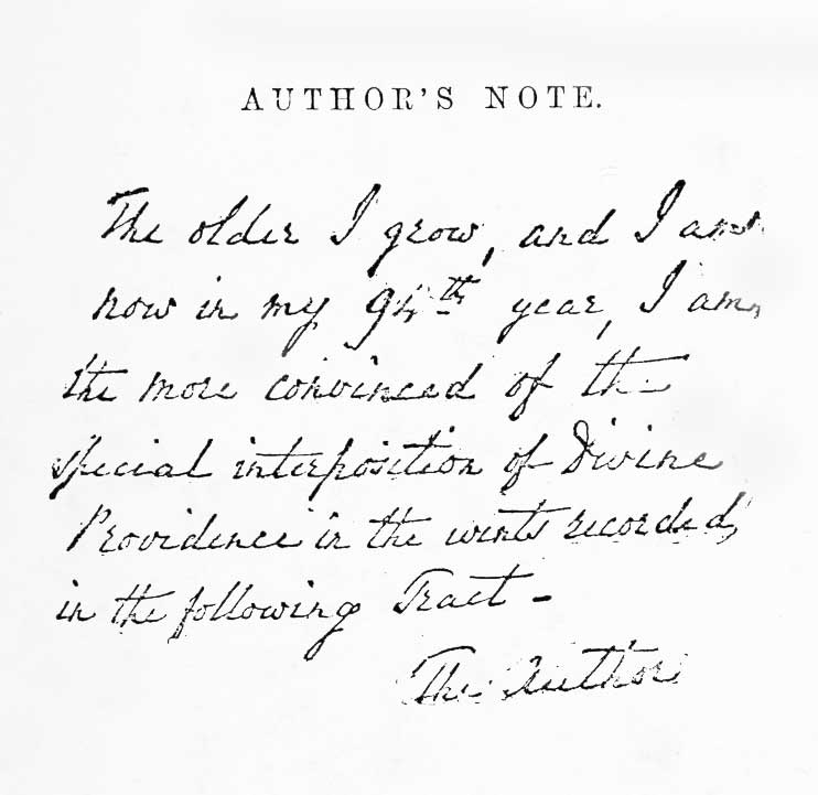 [7] This narrative has been translated into the French, Spanish, Swedish, Italian, German, and Russian languages, and the author (born March 16, 1787) still enjoys good health (1880) while writing the preface to this edition, of which a facsimile is given at the beginning of the book.