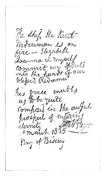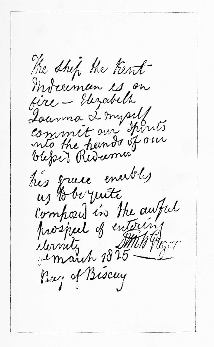 "A bottle was picked up on Saturday, the 30th September, at Bathsheba (a bathing-place on the west of Barbadoes), by a gentleman who was bathing there, who, on breaking it, found the melancholy account of the fate of the ship Kent, contained in a folded paper written with pencil, but scarcely legible." The words of the letter were then given, and a facsimile of it will be found on the next page. The letter itself, taken from the bottle thickly encrusted with shells and seaweed, was returned to the writer when he arrived, shortly after its discovery, at Barbadoes, as Lieut.-Colonel of the 93rd Highlanders, and the interesting relic is still preserved by his son (at that time called "little Rob Roy"), who is not mentioned in the letter, but was saved as related in page 33.