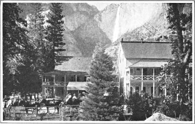Not many visits were made to the Valley before 1855. The first regular tourists’ visit was made by J. M. Hutchings, who, having heard of its wonderful scenery, collected a party and went there. The following year regular tourist travel began. The first house built in the Yosemite Valley was erected in 1855. This was afterwards known as Black’s Hotel. It was situated directly opposite the Yosemite Fall. Years ago the old Sentinel Hotel was built by the side of the Merced River, and as patronage increased three cottage annexes to this simple hostelry were erected—one immediately adjoining the hotel building and two across the road. In time a small village grew up along the road and camps were established in the meadows and woods near by. The old Sentinel has now given way to the large new hotel across the river near the foot of the falls. This opens in the beginning of 1917.