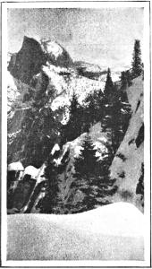 The climb to Glacier Point is of all the most popular. There are three methods of making the ascent—on foot, on horseback, and by auto-car. A great many prefer the horse or mule and the bridle path. This trail leads from the valley floor along the banks of the Merced River and past and above Vernal Falls and on to Nevada Falls. Then it follows the picturesque Illilouette Creek to its fall. Then the trail ascends the steep face of the cliff in zig zags. When the last height is won and Glacier Point is reached, the view is worth all the struggle. From Glacier Point may be seen the Tenaya Canyon, the Vernal and Nevada Falls, the Cap of Liberty, Half Dome, the High Sierra, and most of the Yosemite Valley. There is a comfortable little hotel and a camp at Glacier Point. Many stay over night, and use the spot as a point of departure on various trails—for Sentinel Dome, Taft Point, Dewey Point, and the long trail tramp to Wawona.