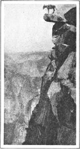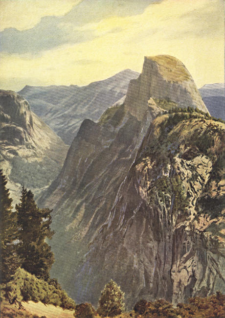 Half Dome was first ascended in 1875 by George Anderson. He practically pulled himself to the summit by means of a rope attached to iron pegs driven in the rock. He inserted his bolts five or six feet apart, and made his rope fast to each in succession, resting his feet on the last bolt while he drilled a hole for the next above. He accomplished his ascent in a few days; and he hoped to complete a stairway, so that tourists might ascend the Dome. But while he was preparing timber for his stairway he was taken sick, and died all alone in his little cabin.