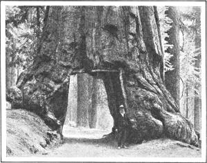 A most interesting feature of the Yosemite region is the Big Trees. There are three groves of giant trees near the valley—the Tuolumne, Merced, and Mariposa. The first two named are small groves. The important grove is the Mariposa. This grove is so called from its situation in Mariposa (Butterfly) County. It occupies a tract of land about four square miles in area, and consists of two definite groups of trees. Its elevation above the sea level varies from 5,000 to 8,000 feet.