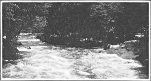 From Register Rock the trail, which now becomes narrower and steeper, makes a wide sweep to the right before reaching the top of Vernal Falls, where the flat rock permits an approach to the edge of the water. Just above is the beautiful Emerald Pool. The trail recrosses the river about half-way between the top of Vernal Falls and the bottom of Nevada Falls. Above the bridge is the Diamond Cascade, and below it is the Silver Apron, both beautiful waterfalls. From here may be obtained a fine view of the superb Nevada Falls. A steep and zig-zag trail leads to its top.