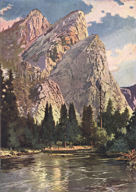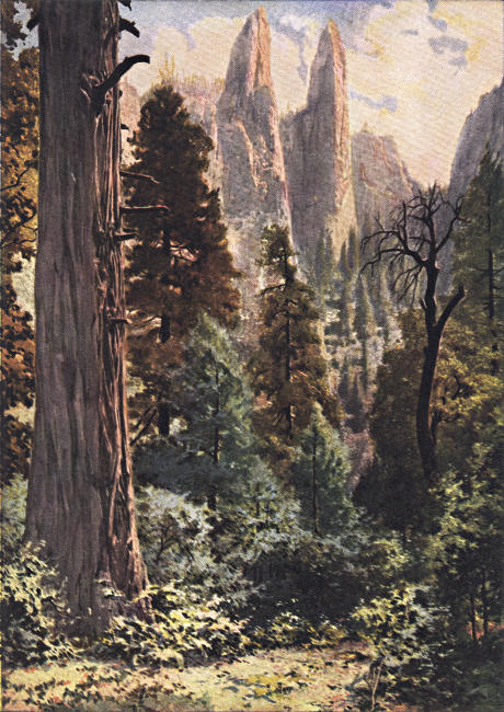 Guarding the Bridal Veil Falls are the Three Graces. These look across the Valley to their counterparts, the Three Brothers. Near them are Cathedral Rock and Cathedral Spires. Cathedral Rock is not so high nor so massive as El Capitan, nor are its sides quite so nearly vertical. Its summit is 2,660 feet above the Valley. The graceful pinnacles of rock called Cathedral Spires are isolated columns of granite. From one point of view these spires rise above the edge of the cliff exactly like two towers of a Gothic cathedral. They are said to have been given their name because of a fancied resemblance to the Duomo at Florence, in Italy.