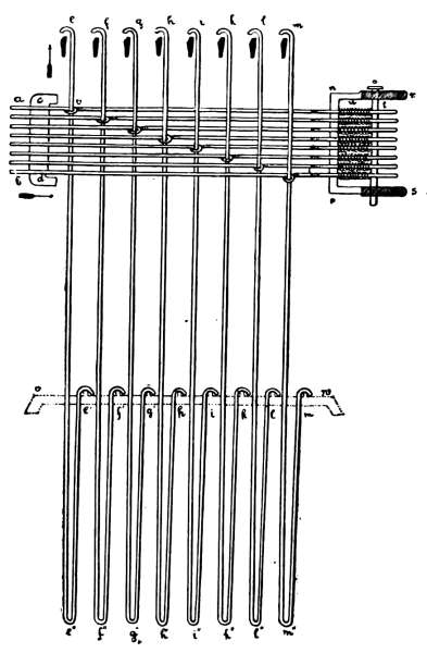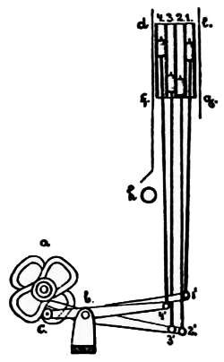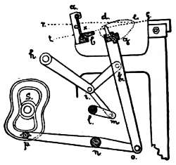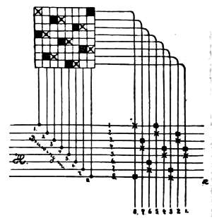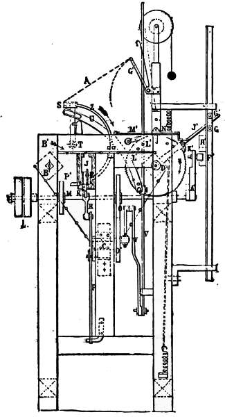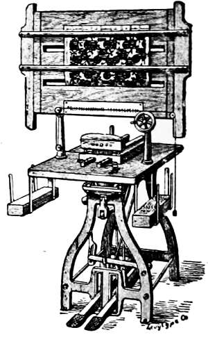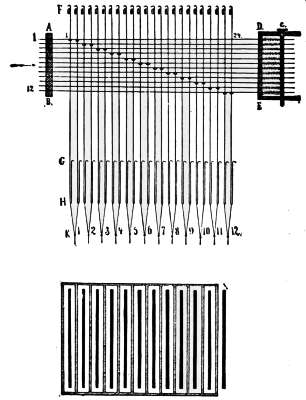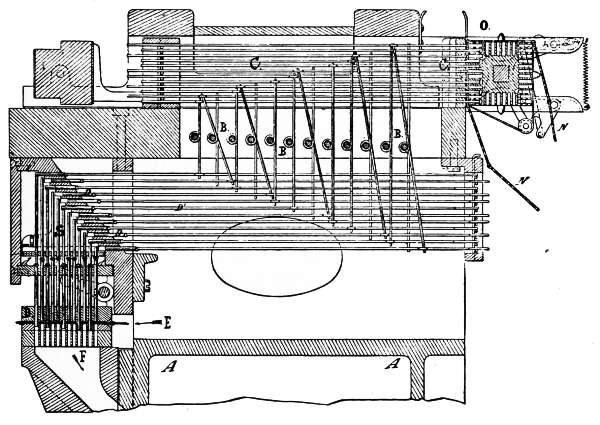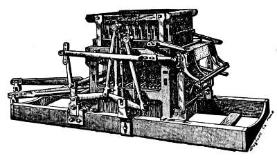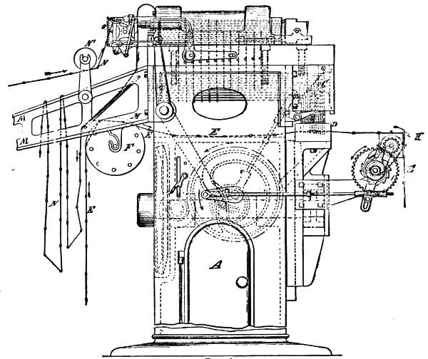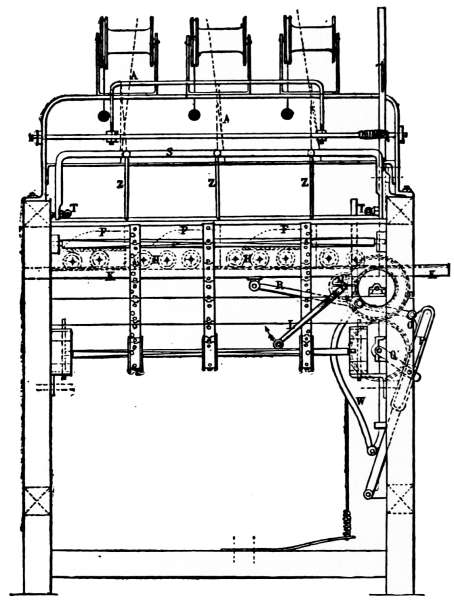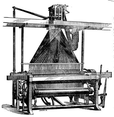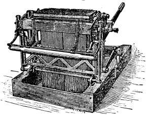 M. Bouchon, in 1725, employed a band of pierced paper pressed by a hand-bar against a row of horizontal wires, so as to push forward those which happened to lie opposite the blank spaces, and thus bring loops at the lower extremity of vertical wires in connection with a comb-like rack below. M. Falcon submitted in 1728 a chain of cards, and a square prism, known as the cylinder, in lieu of the band of paper of Bouchon. In 1745, Jacques de Vancanson suppressed altogether the cumbrous tail-cards of the draw-loom, and made the loom completely self-acting by placing the pierced paper or card upon the surface of a large pierced cylinder, which traveled backwards and forwards at each stroke, and revolved through a small angle by ratchet work. He also invented the rising and falling griffe, and thus made a machine very nearly resembling the actual Jacquard.