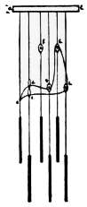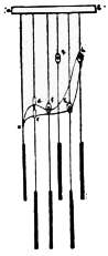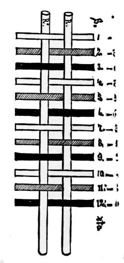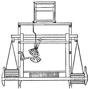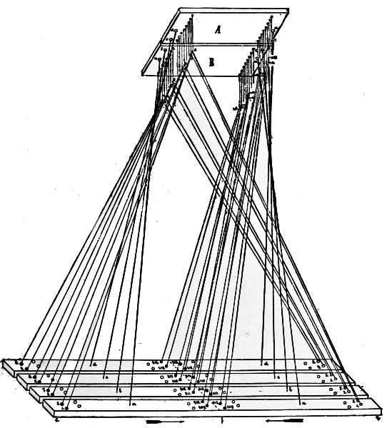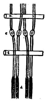 On the harness-cords are adjusted the heddles, (either twine or wire), on which are fastened the lingoes as weights. In the mails of the heddles are drawn the warp-threads.