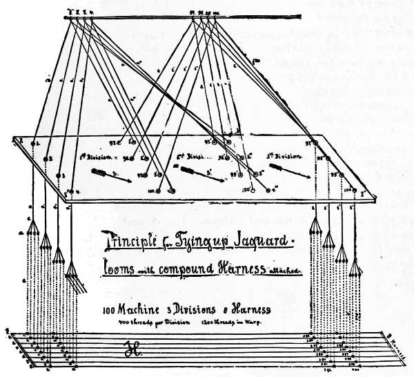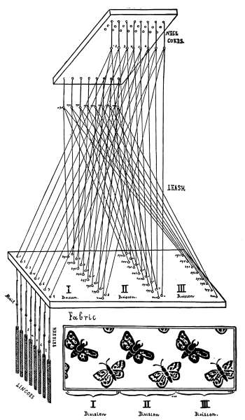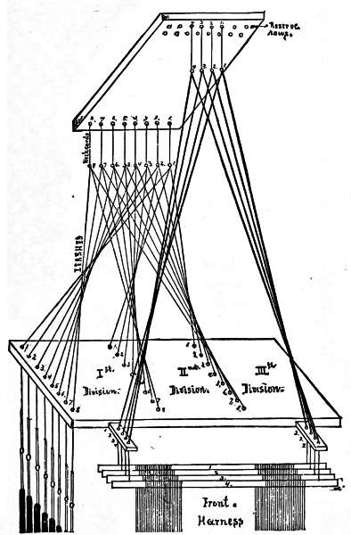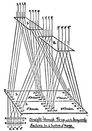 If a fabric contains a great number of ends of warp bound differently in the filling, the method of guiding the warp by harness frames is too cumbrous and inefficient; in such cases it becomes necessary to use the Jacquard machine for raising the warp-threads separately by means of hook and leash.