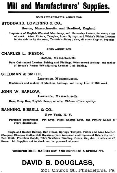 Thomas Wood & Co., Fairmount Machine Works, Twenty-Second and Wood Streets, Philadelphia, Pa. Power Looms. Patent Bobbin Winding Machines. Patent Cop Winding Machines. Improved Presser Beaming Machines. Plain Beaming Machines. Improved Reels for Wool, Worsted, Cotton, Linen, etc. Improved Presser Spoolers. Plain Spoolers. Warp Splitting Machines. Hank Twisting Machines. Warping Mills with Patent Driving Heads and Improved Hecks. Single and Double Warp Sizing Machines. Dyeing Machines for Warp and Piece Goods. Cradle and Cone Indigo Mills. Fulling Mills. Calendering Machines. Self-acting Wool Scouring Machines. Yarn Bundling Presses. Loom Beam Trucks. Shafting, Hangers, Pulleys, etc. Adjustable Self-oiling Bearings. Patent Friction Pulleys. Improved Cut-off Coupling. Patent Couplings. Patent Loose Pulleys. Gearing. Elevators. Plans Made and Factories Completely Equipped with Machinery.